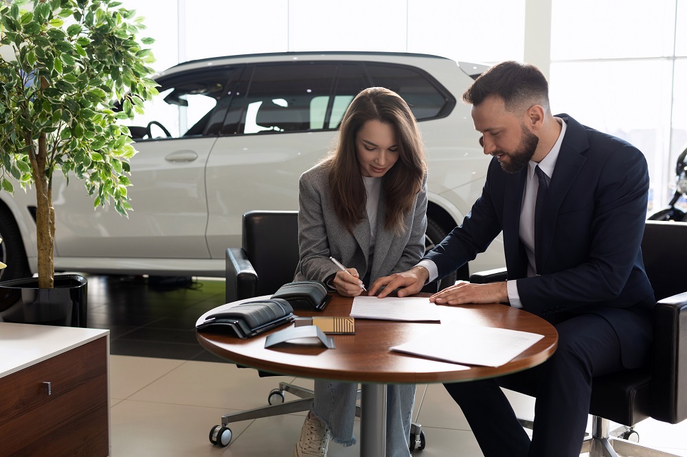 car dealership employee helps fill out new car purchase paperwork.