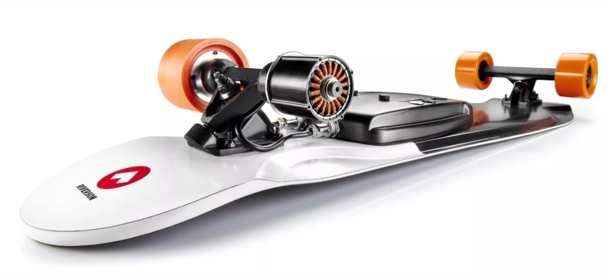 La planche pèse 4.8 kg et est mue par un double moteur de 500W chacun lui permettant d’atteindre une vitesse de 28 km/h durant une dizaine de kilomètres. La batterie amovible affiche une charge de 3.5 Ah et il vous faudra deux bonnes heures pour réalimenter le tout afin de répartir frais et dispo sur les route, en sachant que le skate peut engouffrer une déclivité de 20%, plutôt pas mal. Pour les descentes du même acabit, il est pourvu de freins moteurs vous permettant d’avoir moins de chance de vous viander dans un buisson devant vos potes.