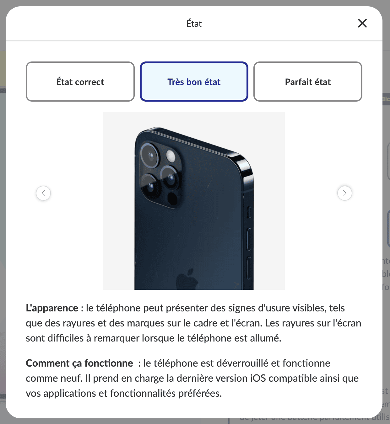 - Critères : parfait état et batterie à 89 %.