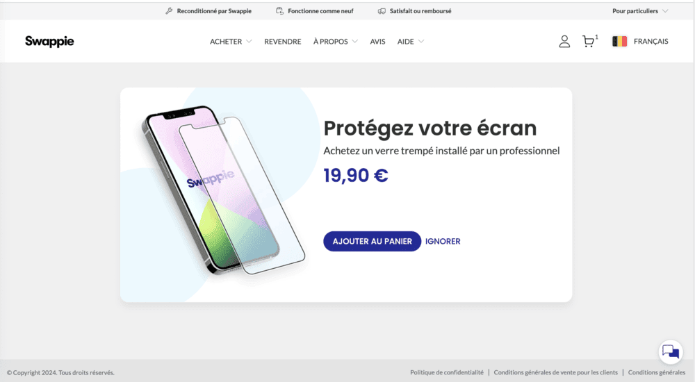 Après avoir sélectionné le téléphone, Swappie m’a proposé une avalanche d’accessoires. Pas mal, même si cela m’a rappelé une certaine compagnie aérienne irlandaise (sans l’agressivité, heureusement).