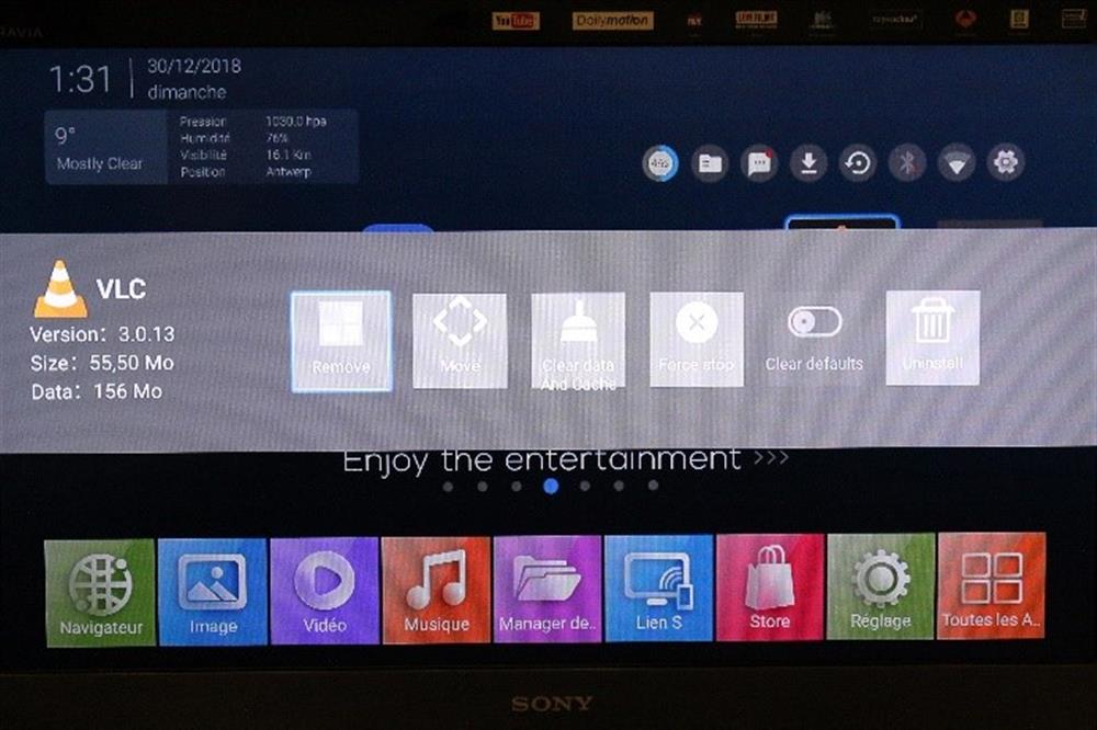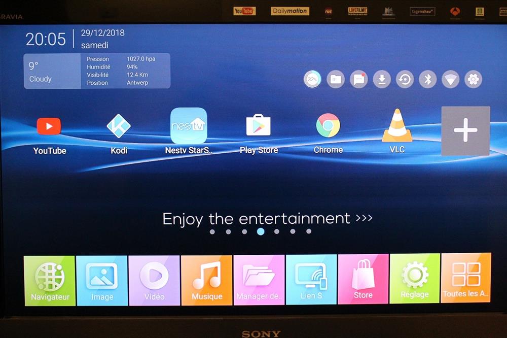 Une seule application est digne d’intérêt : l’application Store qui permet de démarrer le Play Store. Il vous faudra vous connecter avec un compte Google pour accéder à la pléiade d’applications qui a un intérêt pour les Smart TV : Kodi, VLC, YouTube, NetFlix, … Les applications installées peuvent ensuite être ajoutées sur les différentes pages vides de l’écran d’accueil afin de faciliter leur accès.