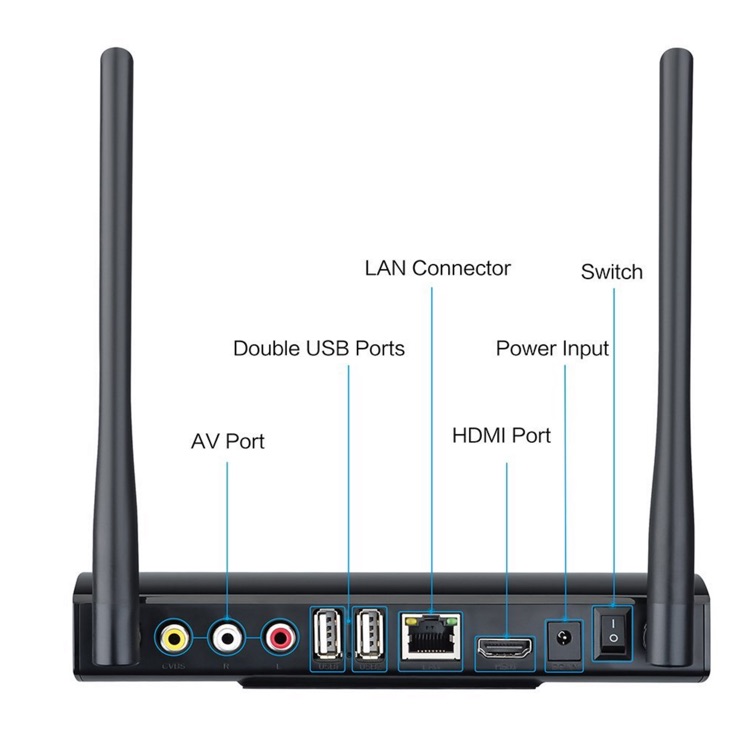 Côté connectique, nous sommes sur du grand classique : 1 HDMI, 2 USB 2.0, une sortie Audio RCA , un port Ethernet RJ45, et, enfin, deux grandes oreilles de lapin de 15 cm pour capter, au mieux, votre réseau WiFi n (en 2.4 GHz seulement). Le boitier est livré avec une télécommande assez peu utile étant donné que j’ai commandé un clavier/souris compact sans fil à 19.50€, toujours sur Amazon.
