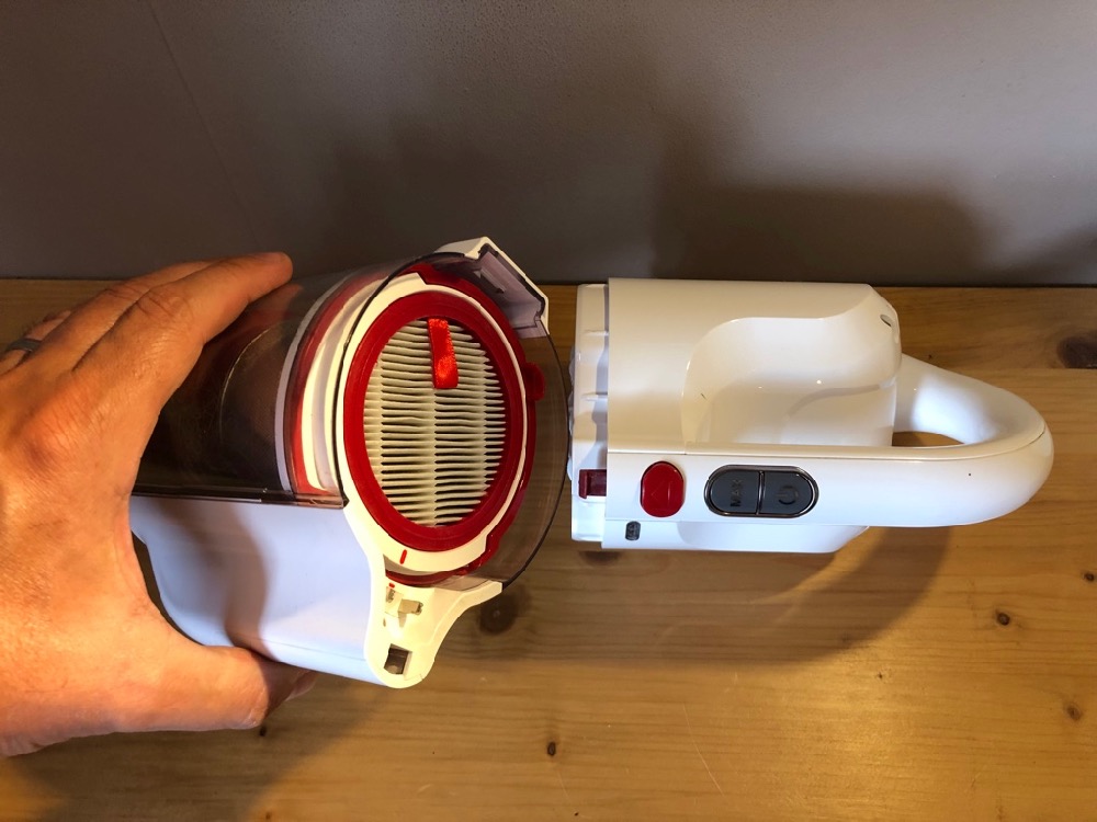 C’est toujours là que cela se corse : vider le bac … et le remettre en place sans lire la documentation. Ici, il faut simplement “déclipser” le haut de l’aspiro pour ensuite retirer le filtre grâce à une petite poignée. A l’intérieur, nous trouvons une turbine recouverte d’acier inoxydable tout à fait impeccable à nettoyer. Ici, les poussières viennent d’agglutiner au fond du bac et le cylindre est vraiment simple à gérer : Un coup de lavette, de torchon, de chiffon ou de serpillère (tout dépend si vous êtes en France ou en Belgique) et le tour est joué.