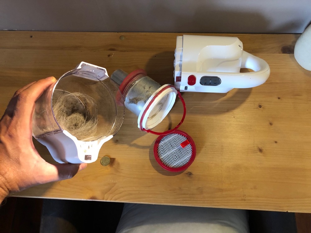 Le Puppyoo est une véritable pompe à crasse qui, grace à sa brosse rotative, viendra à bout d’à peu près tout ce qui traine au sol. Jusque là, l’aspi fait le boulot mais il me faut maintenant tester le balai sur une moquette épaisse. Et c’est là que je m’exclame devant la famille toujours à l’écoute de mes expériences connectées : “Put… de mer…, ce truc est une bombe !“. En moins de 30 secondes, les poils de chien qui étaient bien confortablement installés au fond de la moquette sont ressortis comme un boulet de canon pour aller s’installer dans la turbine en mode centrifugeuse à smoothie.