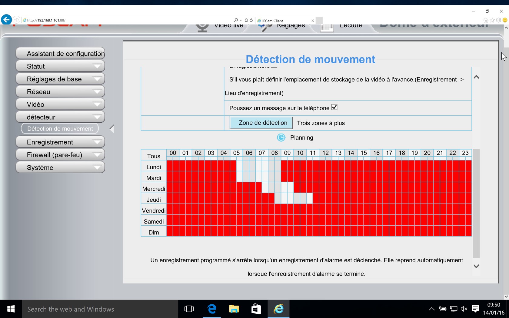Évidemment, si vous achetez une caméra IP, ce n’est pas pour passer votre journée à regarder votre joli intérieur cosi à distance. La Foscam est dotée d’une détection de mouvement assez efficace qui vous préviendra, via l’App, dès que quelque chose bouge chez vous durant votre absence. Via une interface web (non compatible avec les browsers 64 bits), vous allez en effet définir les périodes durant lesquelles vous souhaitez être prévenu ainsi que divers paramètres de sensibilité que nous retrouvons chez la concurrence. L’interface est propre, multilingue et on s’y retrouve facilement dans les méandres du système de paramétrages bien complet.