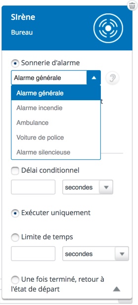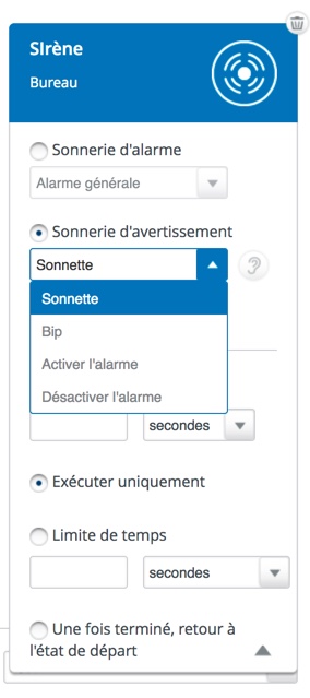 A ce titre, j’illustre ici les différents mode de sirènes, je pense que vous aurez tout le loisir de tester ceux-ci et dés lors créer des scénarios du genre : “Si la porte de la chambre du petit Arthur s’ouvre, faire clignoter la sirène sans la faire hurler” ou “Si un mouvement est détecté sur la terrasse, demander à la sirène d’émettre un simple Bip“. Vous l’aurez compris, tous les scénarios sont permis, y compris les plus saugrenus du genre “Si la fenêtre oscillo-battante s’ouvre et qu’un présence est détectée dans la chambre, envoyer un SMS à Tante Odette pour qu’elle se ramène illico avec un pied de biche pour fracasser la tête … de mon fils qui est rentré plus tôt de l’école et non pas celle du possible cambrioleur“.