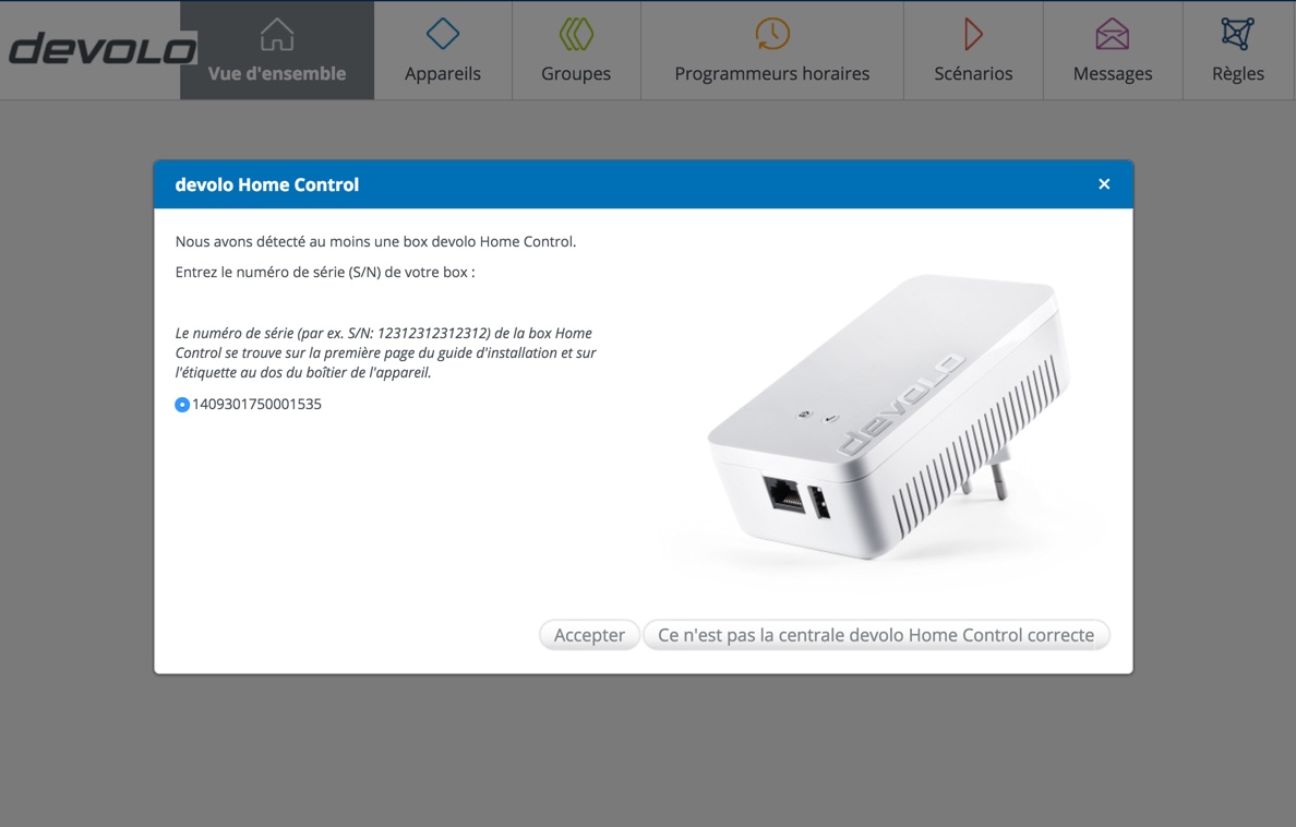 La toute première opération à effectuer est de brancher votre Box Home Control à votre routeur Internet via un câble fourni. Par contre, et c’est mon cas, il est possible de la brancher sur n’importe quelle prise de courant et de la connecter au réseau dLan Devolo. Bref, si vous possédez déjà des modules courant porteur Devolo, c’est évidemment plus sympathique étant donné que vous pouvez l’installer où vous le souhaitez. J’apprécie beaucoup cette possibilité qui m’épargne de connecter 18 boites différentes à mon routeur.