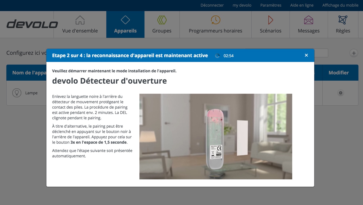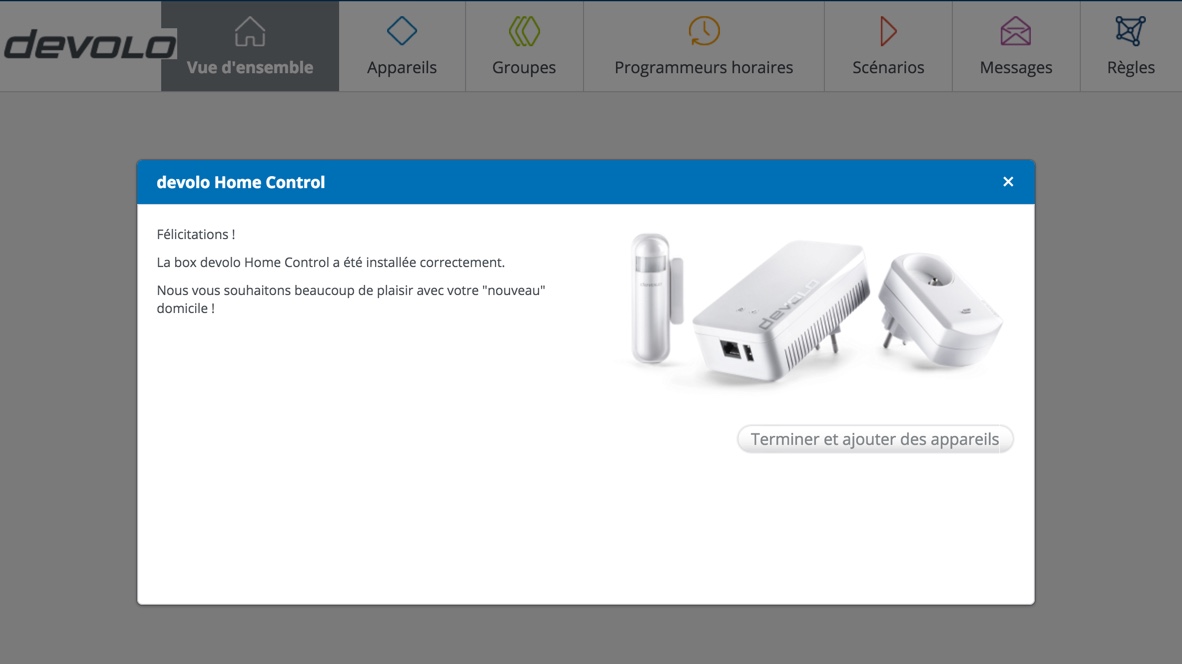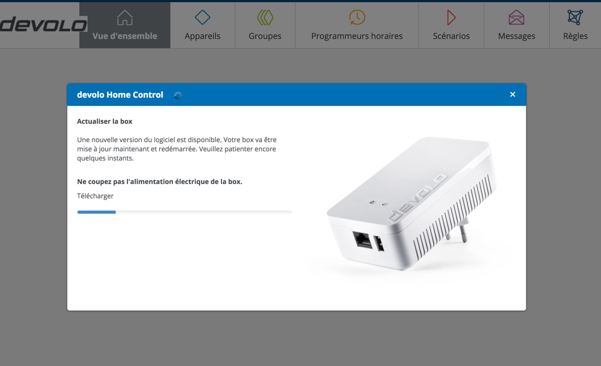 Ensuite, il vous faudra vous connecter sur le portail mydevolo pour vous créer un compte afin de configurer vos joyeux objets domotique. Une fois enregistré, le système trouvera automatiquement votre Box Home Control et se fera un plaisir de la mettre à jour. Cela prend quelques minutes, il suffit de patienter et tout se passe pour le mieux. Vous êtes donc prêt à ajouter vos nouveaux périphériques.