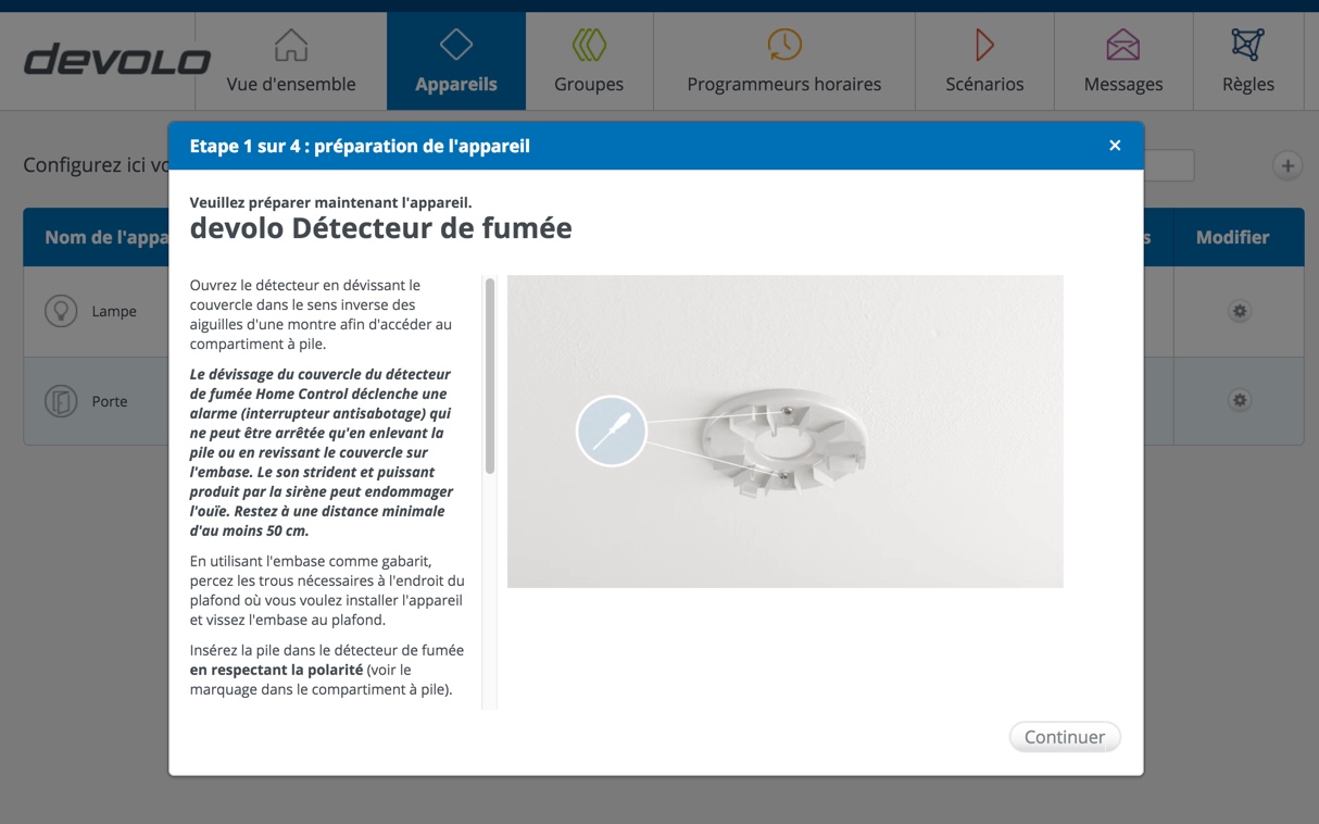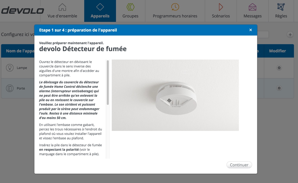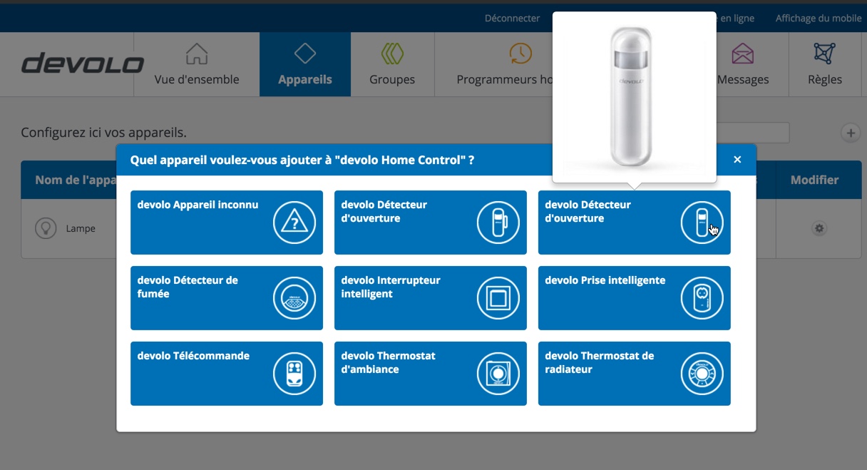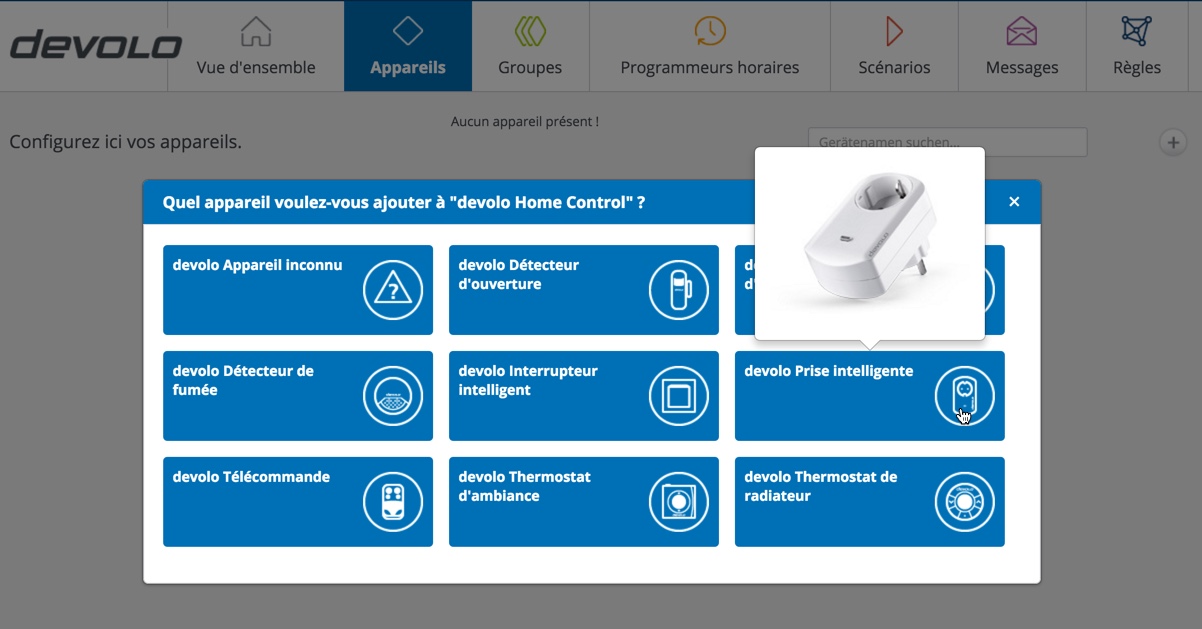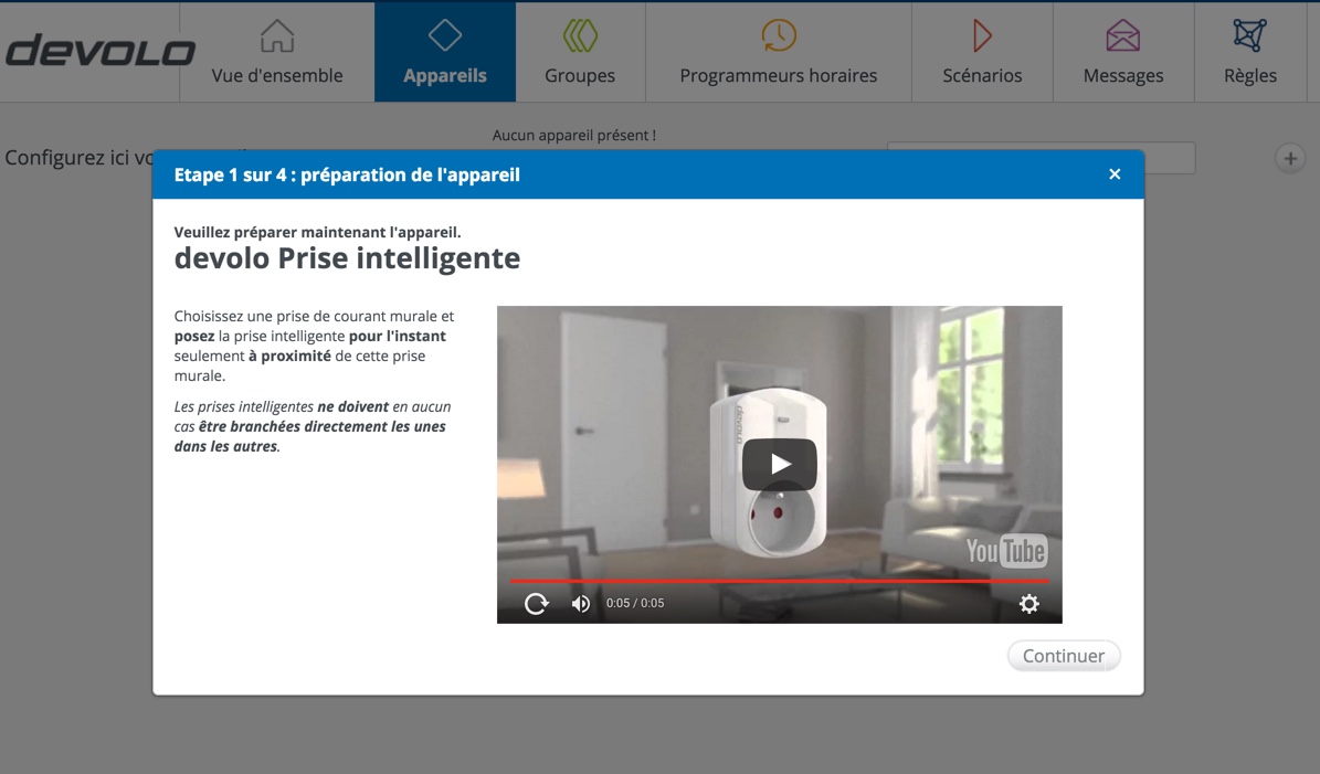 Nous allons débuter par la prise intelligente qui nous permettra, par exemple, d’allumer une lampe à distance. Pour ce faire, il suffit de sélectionner “Prise intelligente” et de suivre les instructions pas à pas. Le gros point positif est la manière dont tout ce petit monde est présenté : Sous la forme de vidéos intégrées dans l’outil de configuration. Superbe.