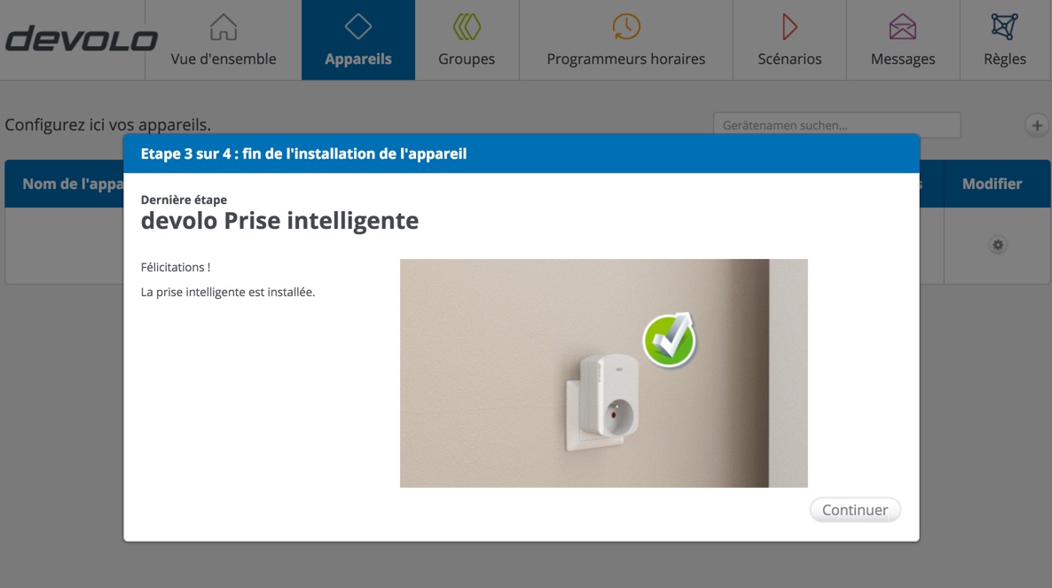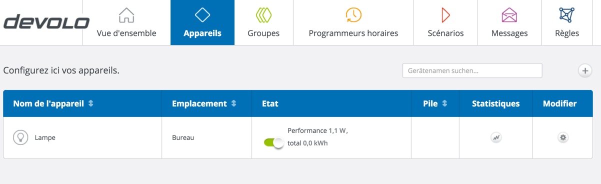 J’insère donc le module dans une prise de courant et j’attends que la petite lampe rouge clignote. Après environ une minute, la LED rouge s’éteint et la prise est alors connectée à votre Box. Rassurez-vous, l’interface web mydevolo vous le confirme. Parfait.