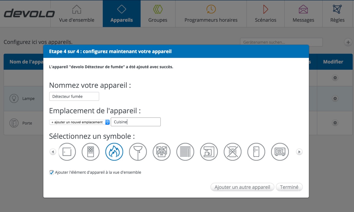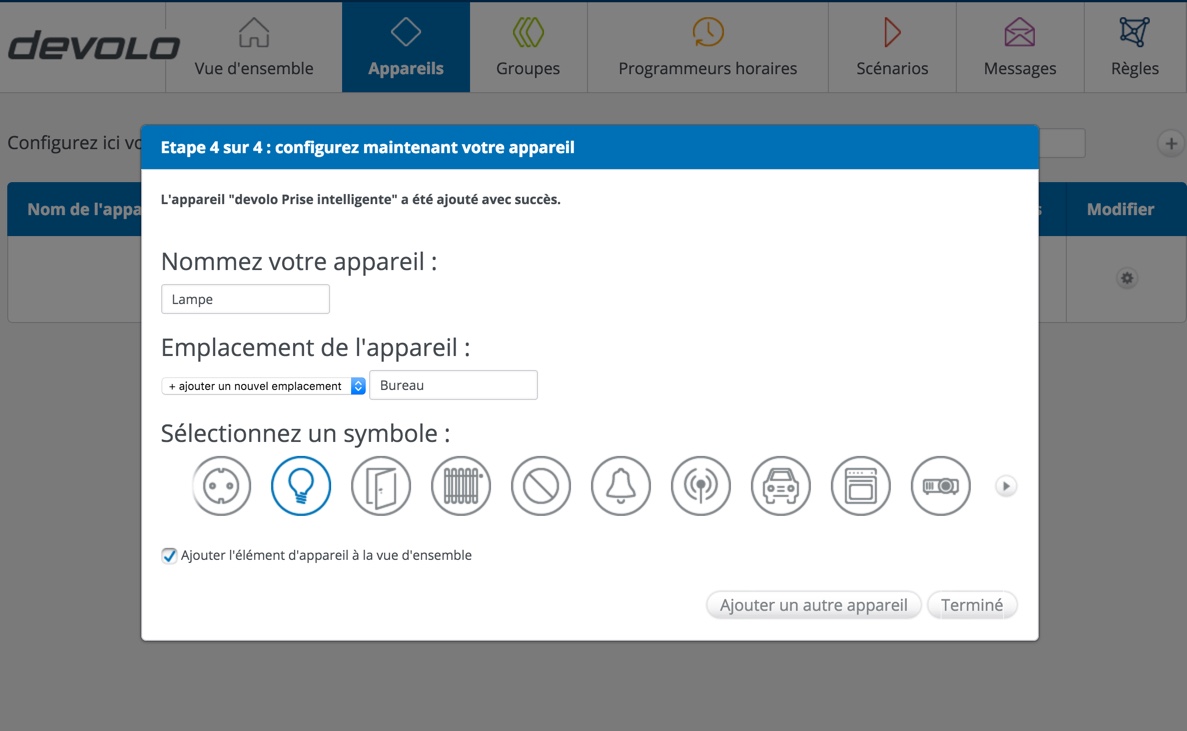 Ensuite, il vous faudra mentionner où se situe cette prise et ce qu’elle va commander (par exemple, la lampe dans le bureau). Voilà, c’est terminé pour la configuration de cette prise. Celle-ci est maintenant disponible dans votre interface et vous pourrez la commander à distance et en connaître la consommation en temps réel ou via des statistiques.