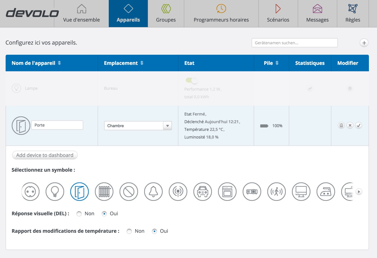 Une fois en place, le détecteur apparaitra directement dans la liste de périphériques et, surprise, celle-ci affiche la température ambiante de la pièce dans laquelle est placé le détecteur, tout en détaillant un historique des ouvertures/fermetures de la porte ainsi que son état actuel (ouvert/fermé). Et ce n’est pas tout, le détecteur est pourvu d’un capteur de luminosité vous indiquant le pourcentage de lumière reçu par le détecteur, sans oublier le niveau de charge de la batterie, évidemment.