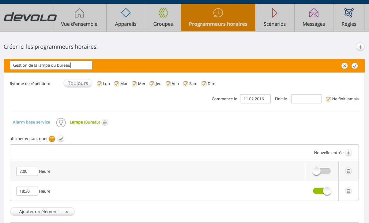 Oui, cela commence doucement à devenir intéressant. Nous allons maintenant définir que notre lampe, installée dans le bureau et connectée à notre prise intelligente, devra s’allumer et s’éteindre à des jours et heures précises. Pour cela, rendez-vous dans la partie “Programmeurs horaires“. Je sélectionne l’objet à programmer : la lampe. Je définis quels jours elle doit être contrôlée, à quelle heure elle doit s’allumer et ensuite s’éteindre. Voilà, c’est ajouté, terminé. Nous avons donc une lampe qui s’allumera, chaque jour, à 18:30 et s’éteindra, le lendemain, à 7h. Bravo, c’est à la portée du premier venu.