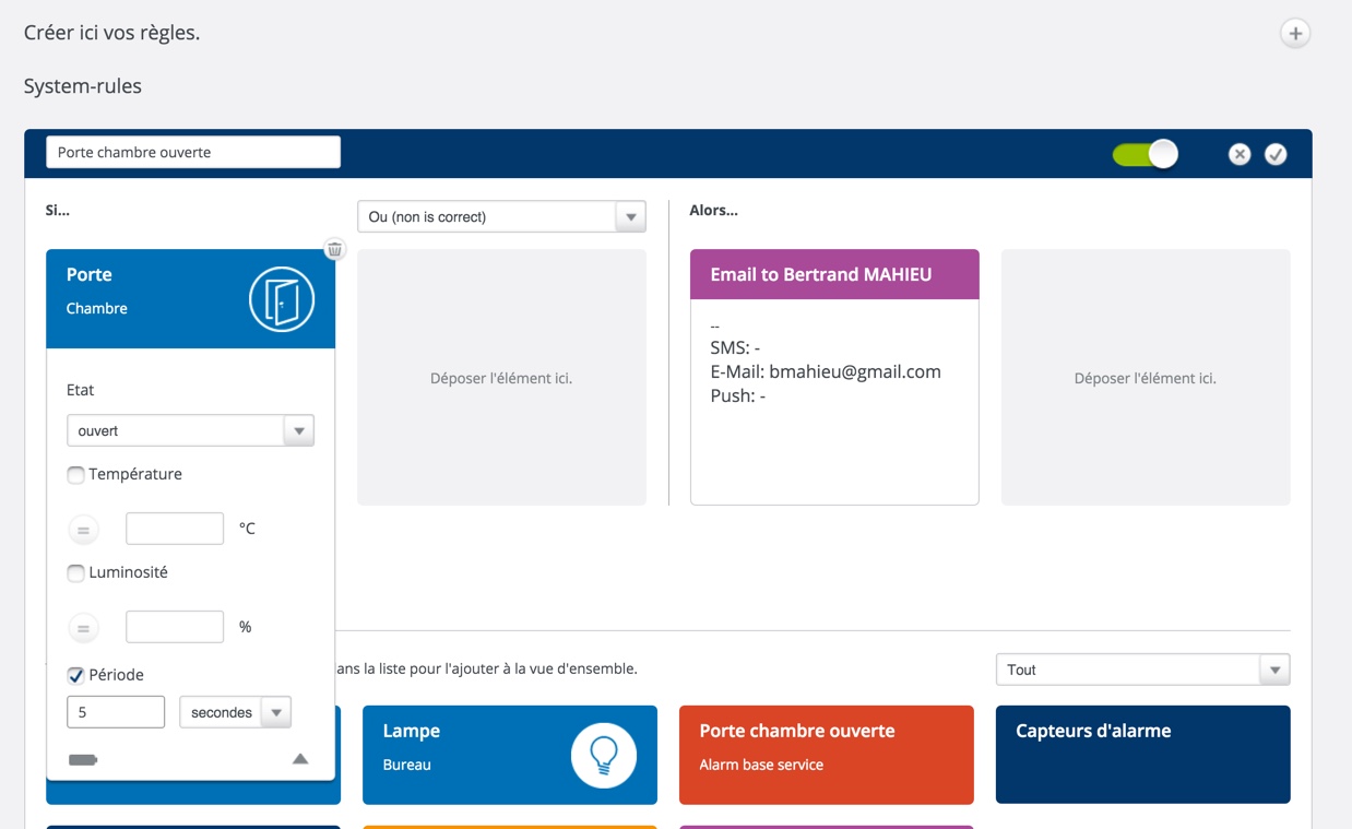 Ah, quelle bonne nouvelle. Nous allons maintenant définir une règle simple : “Si la porte de la chambre s’ouvre durant plus de 5 secondes, je souhaite recevoir un email“. Rien de plus simple, l’interface prévoit tout ce qui est possible. Vous pouvez être averti d’à peu près n’importe quoi. Ensuite, grâce aux programmateurs, vous allez pouvoir définir quand vous souhaitez être prévenu de l’ouverture de cette porte. Vous définissez le “Quoi”, le “Comment”, et le “Quand”. Rassurez-vous, j’ai testé et cela fonctionne : je reçois bien un mail ! … et de suite.