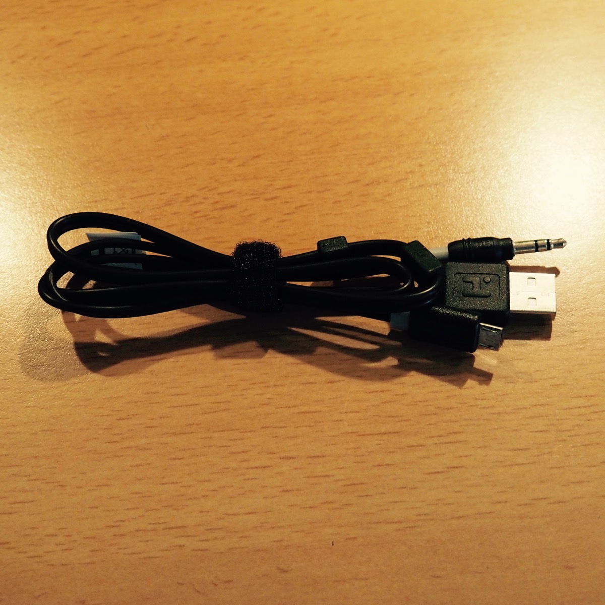 Sur le côté, nous trouvons un bouton à trois positions : Off, Bluetooth ou auxiliaire. Placé sur Bluetooth, mon iPhone l’a reconnu dans la seconde et un “bip” singulier vient confirmer que l’appairage c’est déroulé avec succès. Tout va bien. A noter, la présence d’un câble assez original qui regroupe une fiche micro USB pour la recharge et une fiche jack 3.5 mm pour connecter un autre dispositif non Bluetooth. J’aime l’idée, ça évite des câbles inutiles. Le vaisseau peut également faire office de kit main-libre, il suffit d’appuyer sur le bouton “Décrocher” (assez discret) pour commencer la conversation.