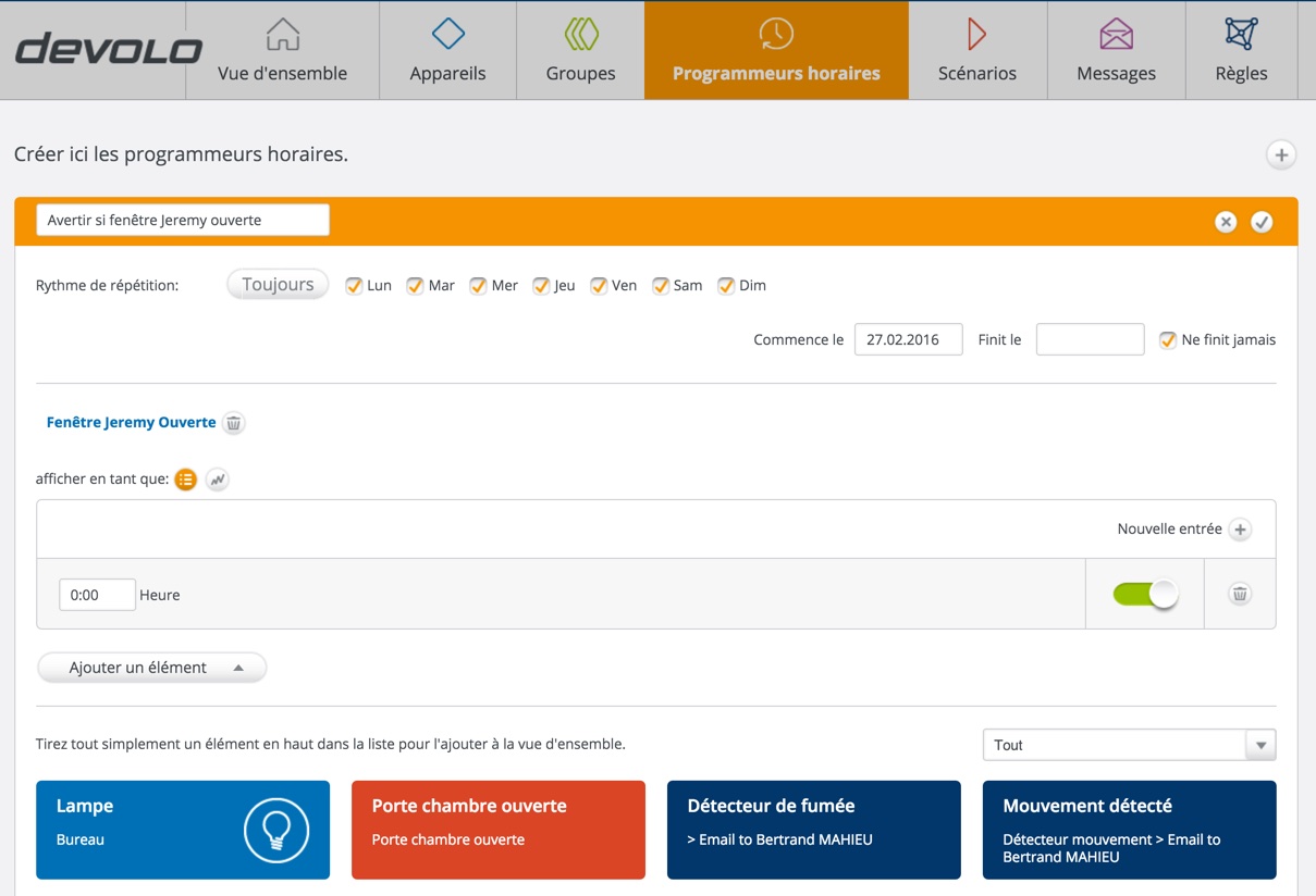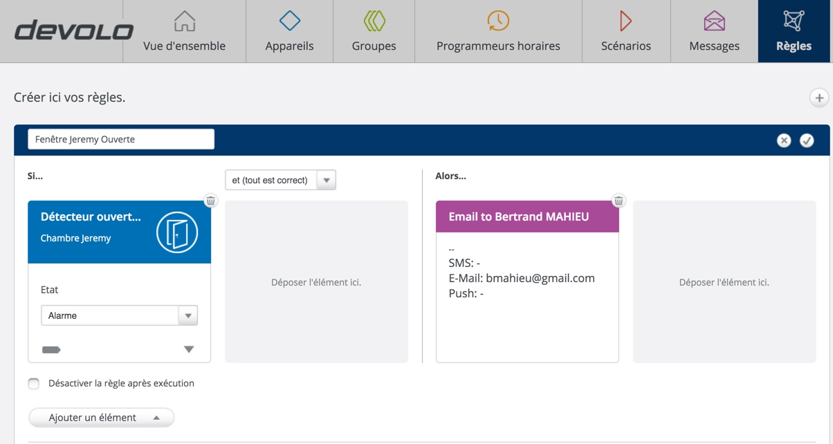 Ensuite, il me suffit de créer une règle : “Si la fenêtre de Jeremy s’ouvre, alors envoie un mail“. Je me suis ensuite assuré que cette règle était valable en permanence et j’ai réalisé un test d’ouverture. Résultat : J’ai bien reçu un mail d’alerte.