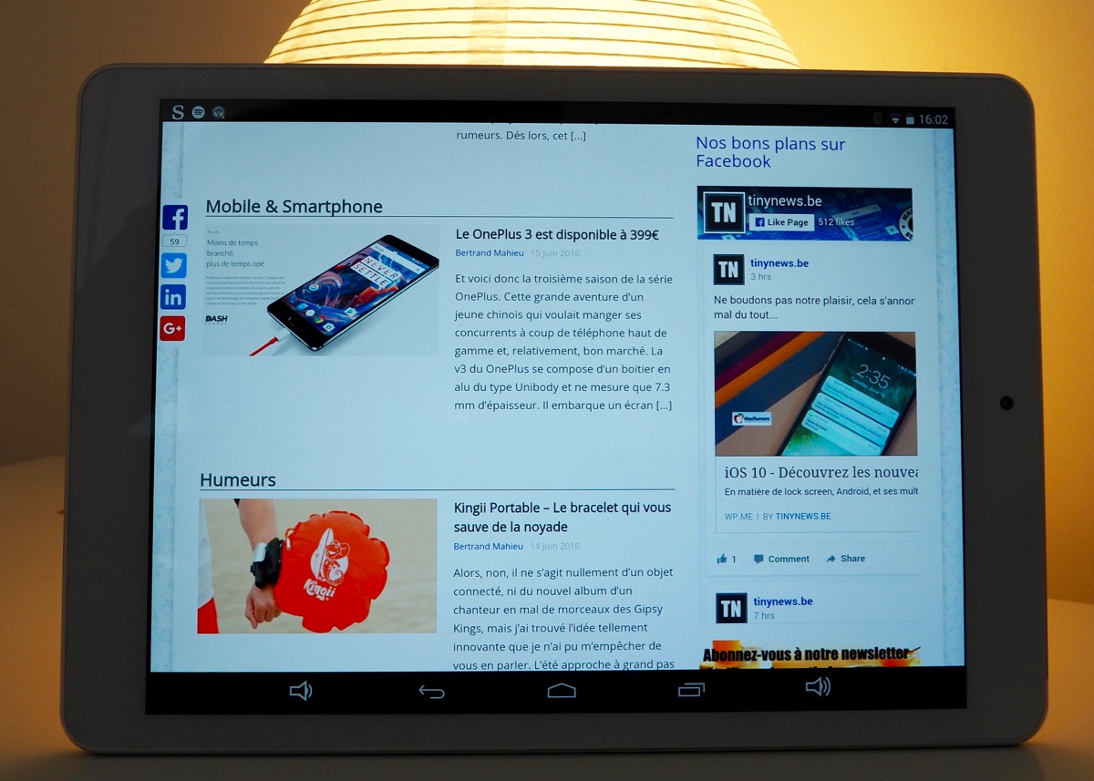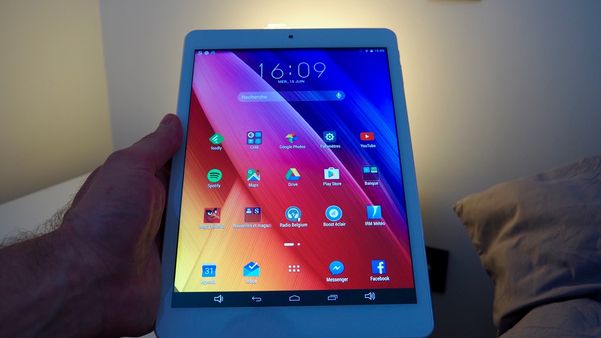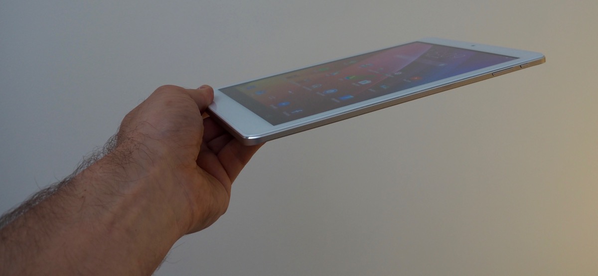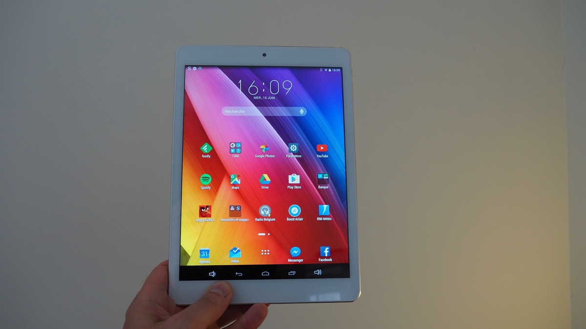 Côté capteur photo, il offre 8 Mpixels à l’arrière et 2 Mpixels à l’avant, suffisant pour Skype. Son poids affiche 540 grammes sur la balance (100 grammes de plus qu’un iPad Air) et ses dimensions au format 4/3 en font un agréable compagnon de lecture et de consultation de sites d’informations. C’est dans ce registre que j’ai d’ailleurs testé cette tablette : réactive et jamais en défaut. Seul bémol, la surface de l’écran est légèrement rugueuse et manque quelque peu de souplesse.
