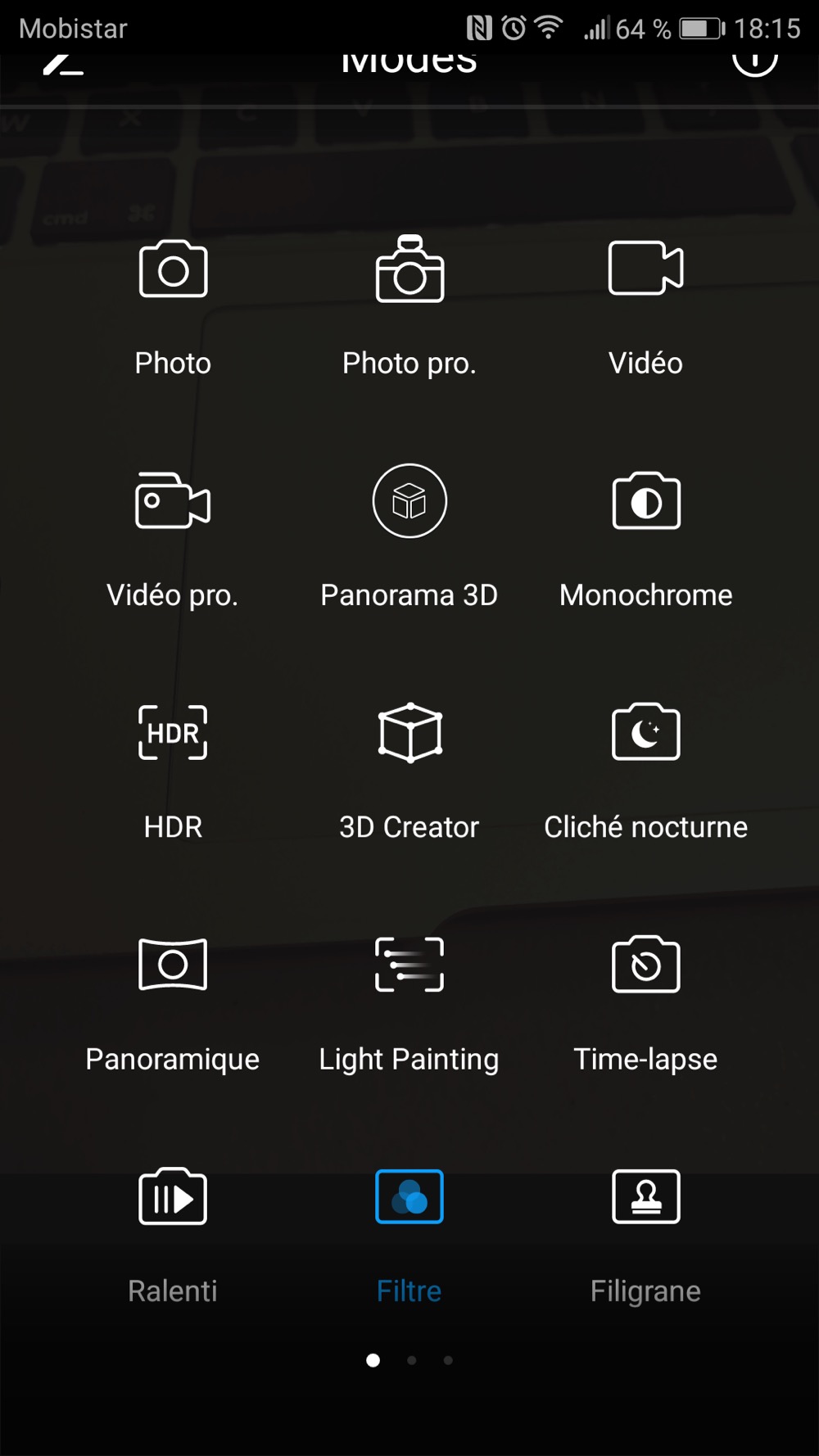 De nombreuses options sont disponibles comme les modes pro (photos et vidéos), le 3D creator, light painting, fonction panoramique ou encore un mode monochrome pour profiter pleinement du plaisir de faire une « vraie »photo en noir et blanc, histoire de vous replonger au temps pas si lointain de Mamy Huguette.