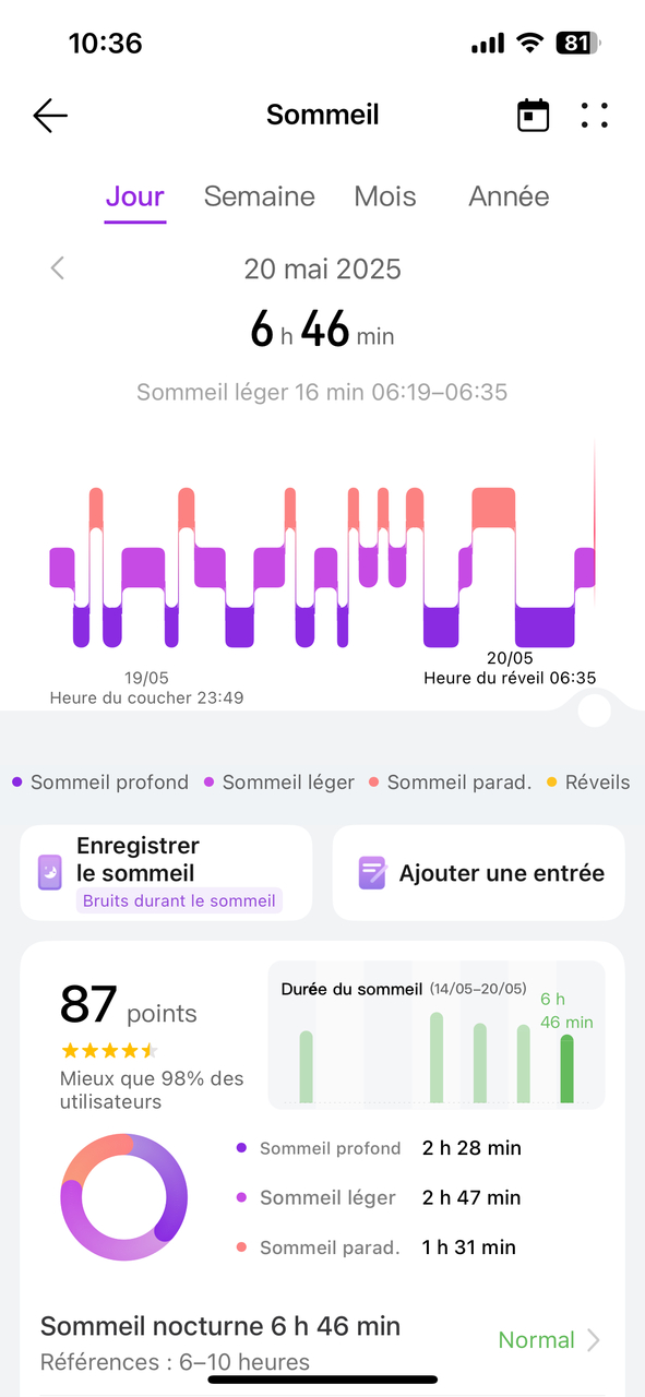 Dans les premiers jours du test, j’avais été assez frustrée par le manque de précision du suivi du sommeil. Mais au fil des semaines, les données s’affinent, et deviennent plus précise et fiable. Il reste quand même quelques données qui restent perfectibles, comme le fait que la montre ne fait pas toujours la distinction entre l’heure du couché et l’heure d’endormissement réel, certains micro-réveils sont ignorés, mais dans l’ensemble, les données sont nombreuses et intéressantes.