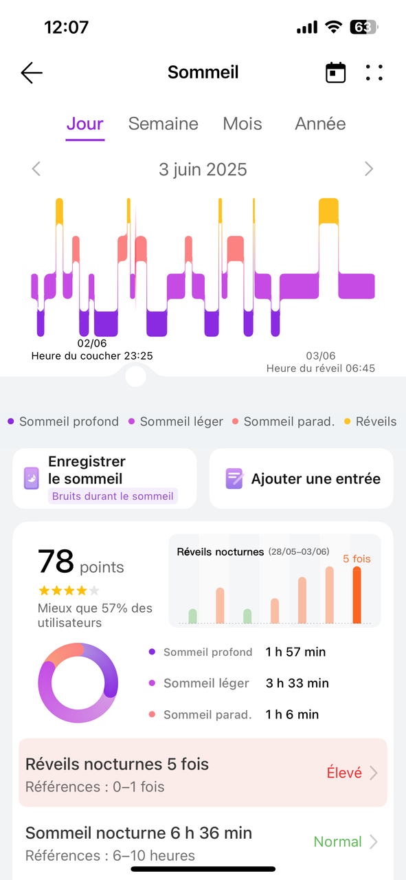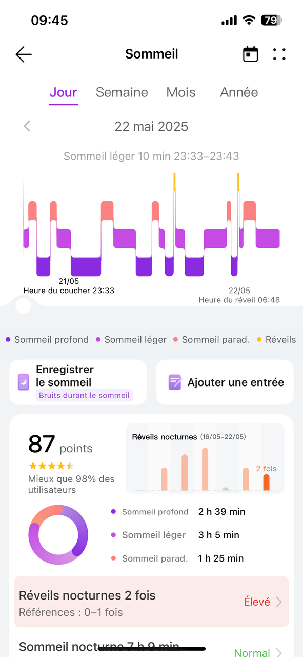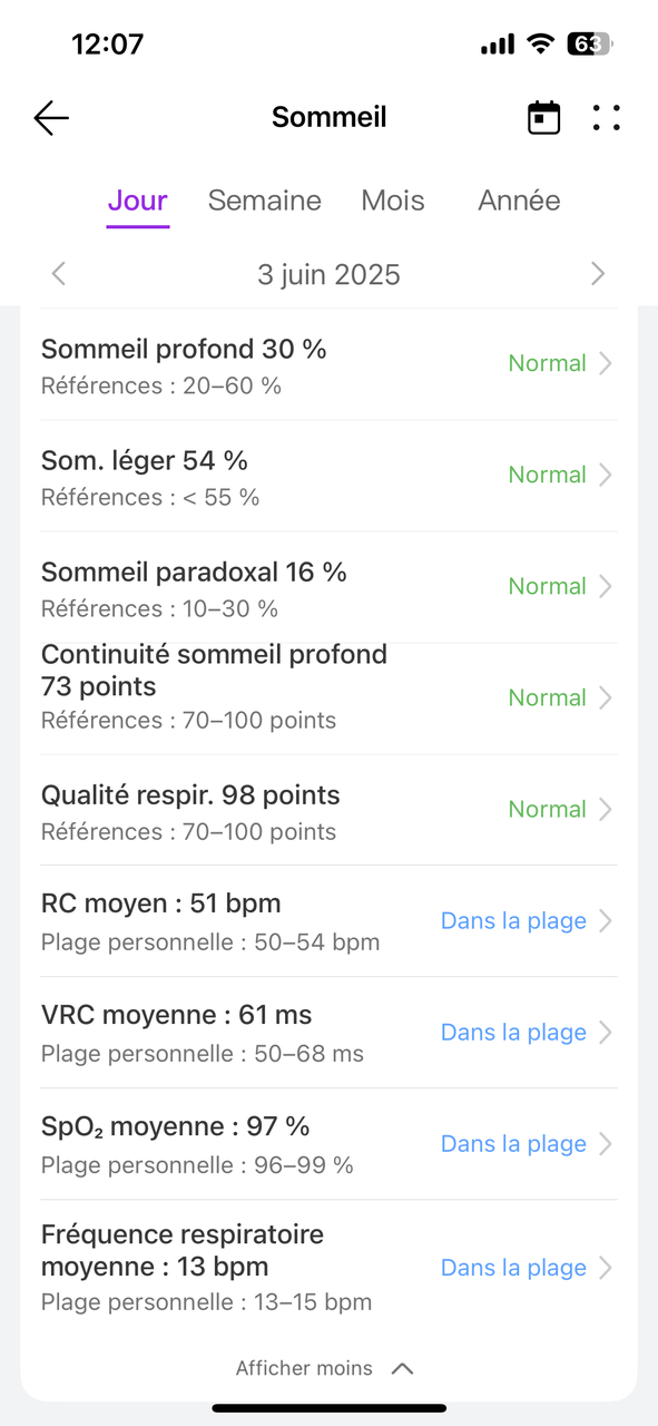 - Phases de sommeil (profond, léger, paradoxal/REM)