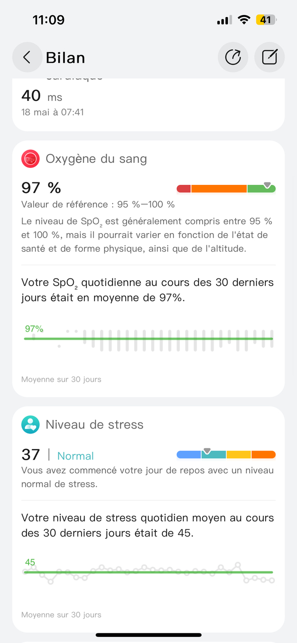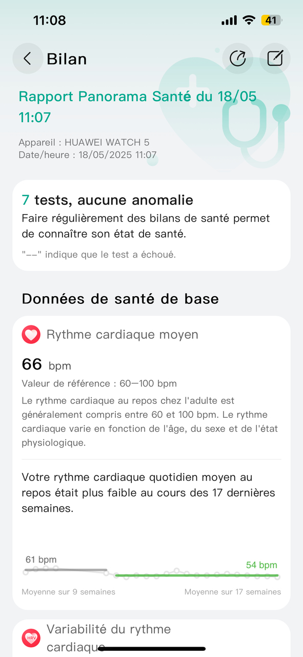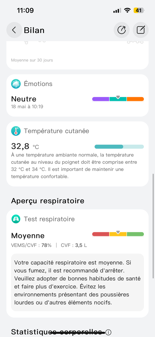 L’analyse démarre, et après environ 45 secondes de mesures au bout du doigt (avec une petite participation de votre part, comme tousser 2-3 fois près de la montre pour le test respiratoire), vous obtenez un rapport complet de votre santé globale.