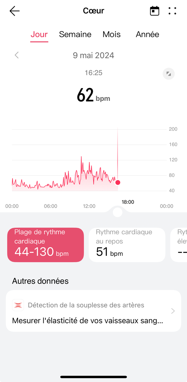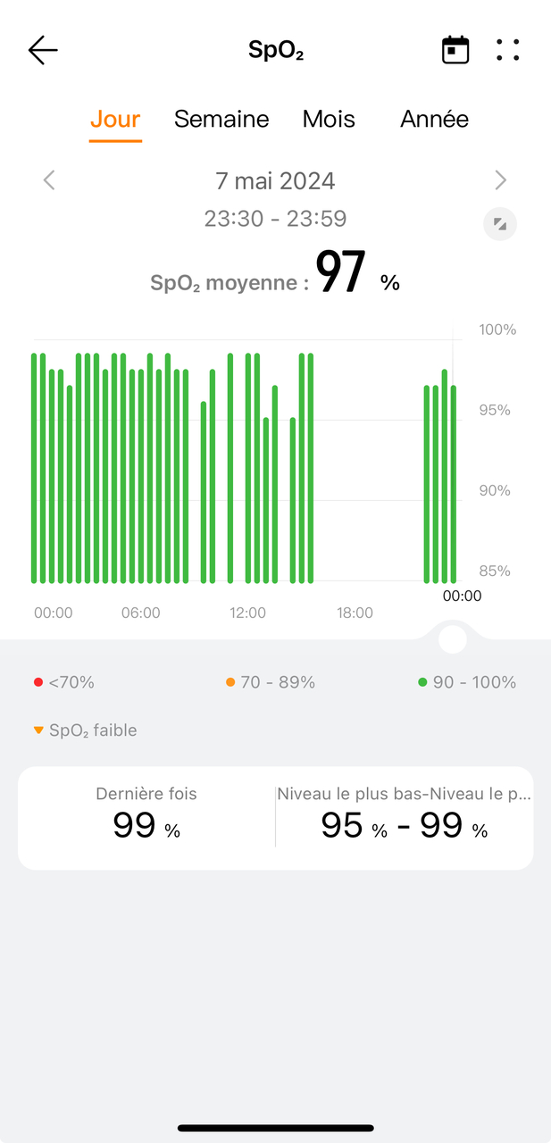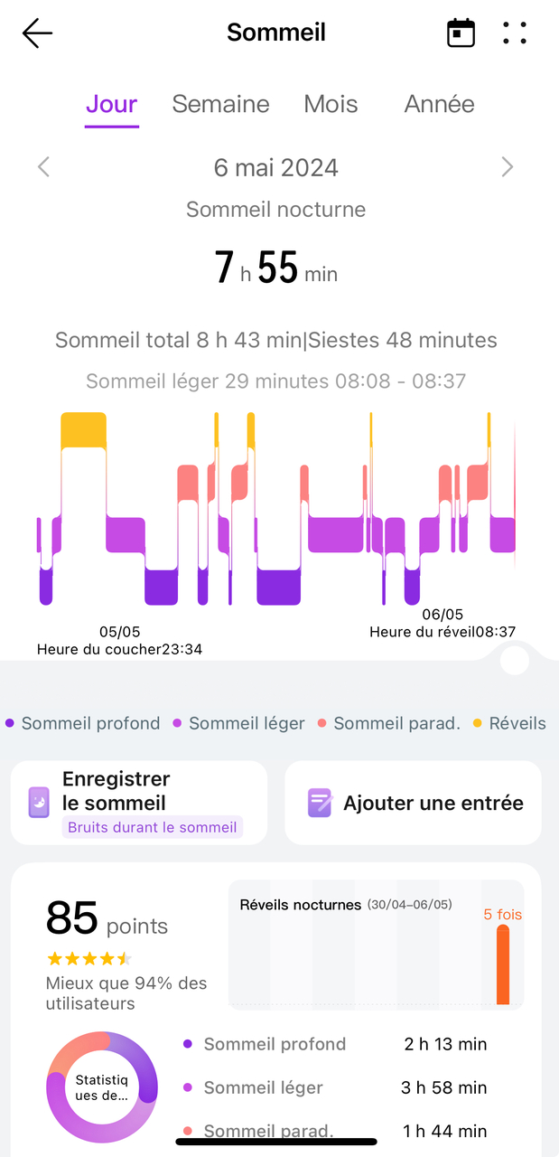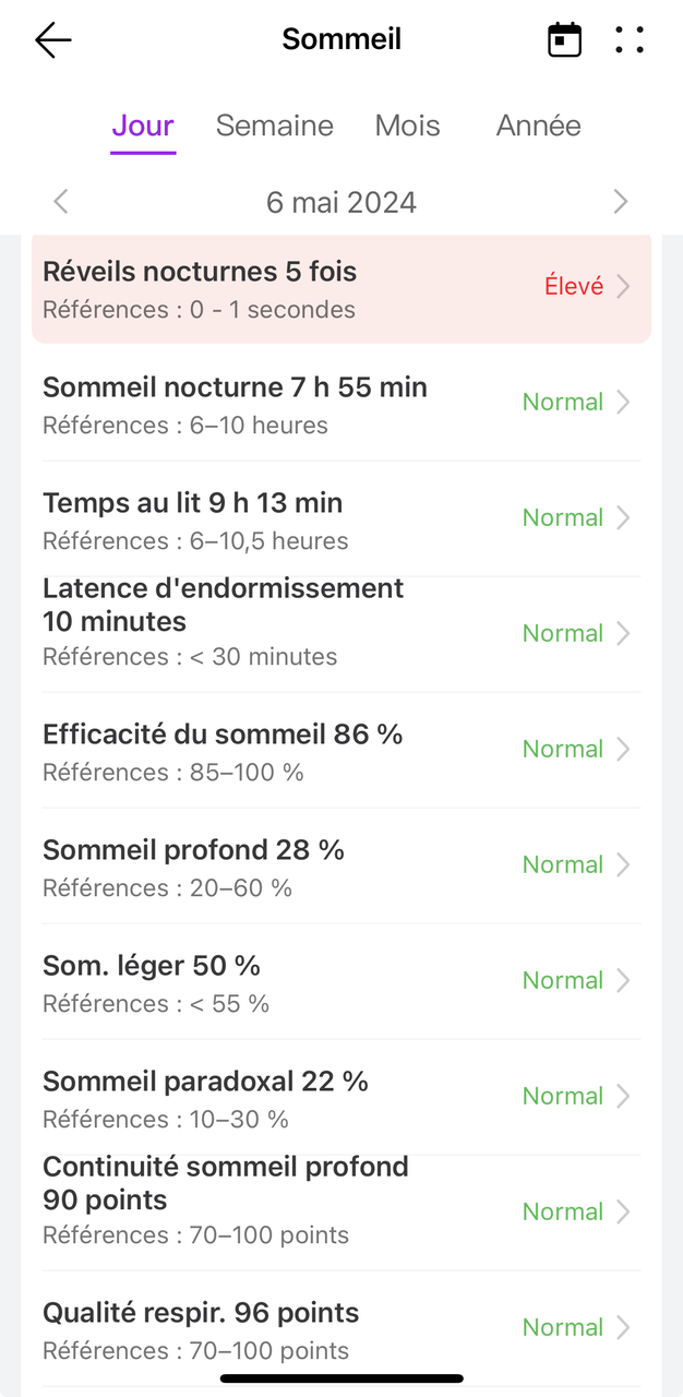 - Phases de sommeil : Les phases classiques de sommeil sont détectées et semblent être exactes, à l’exception des réveils nocturnes où la montre indique parfois un sommeil léger.