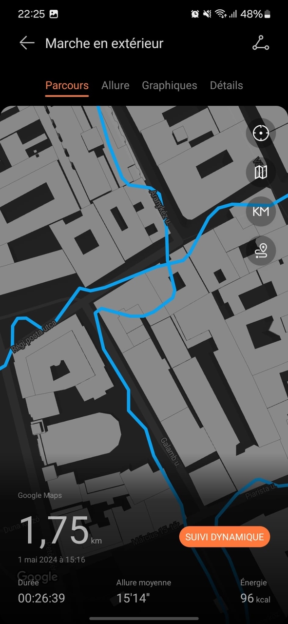 Compte tenu de ces caractéristiques, il ne faut pas s’attendre à une précision GPS exceptionnelle. Matyas a effectivement constaté des écarts de précision et des mesures farfelues que ce soit en ville ou sur terrain dégagé. Pour une montre axée sur le bien-être général, la précision du GPS reste néanmoins suffisante pour la plupart des utilisateurs.
