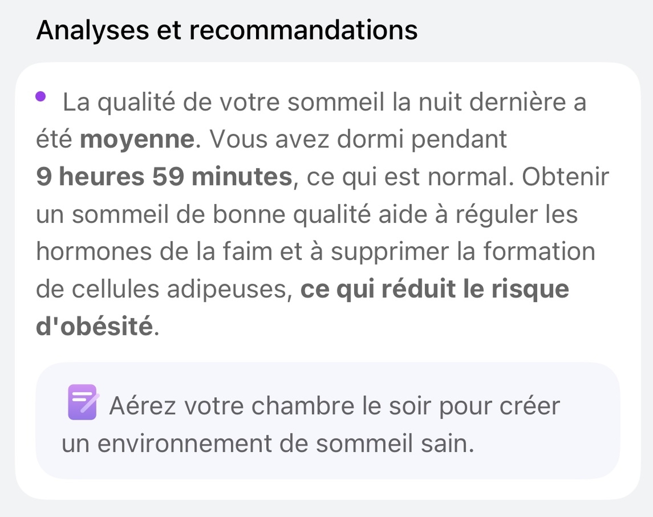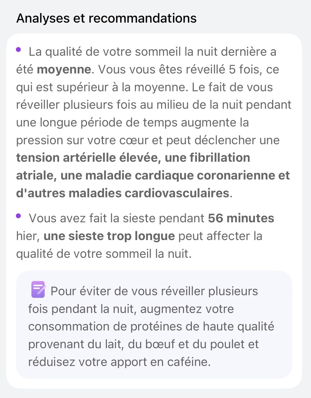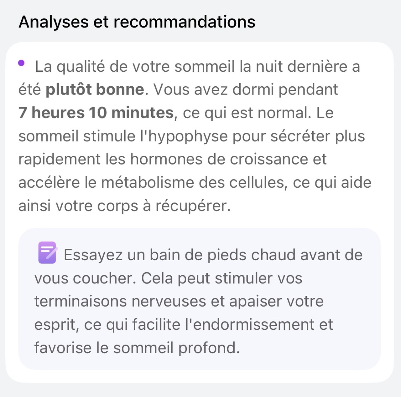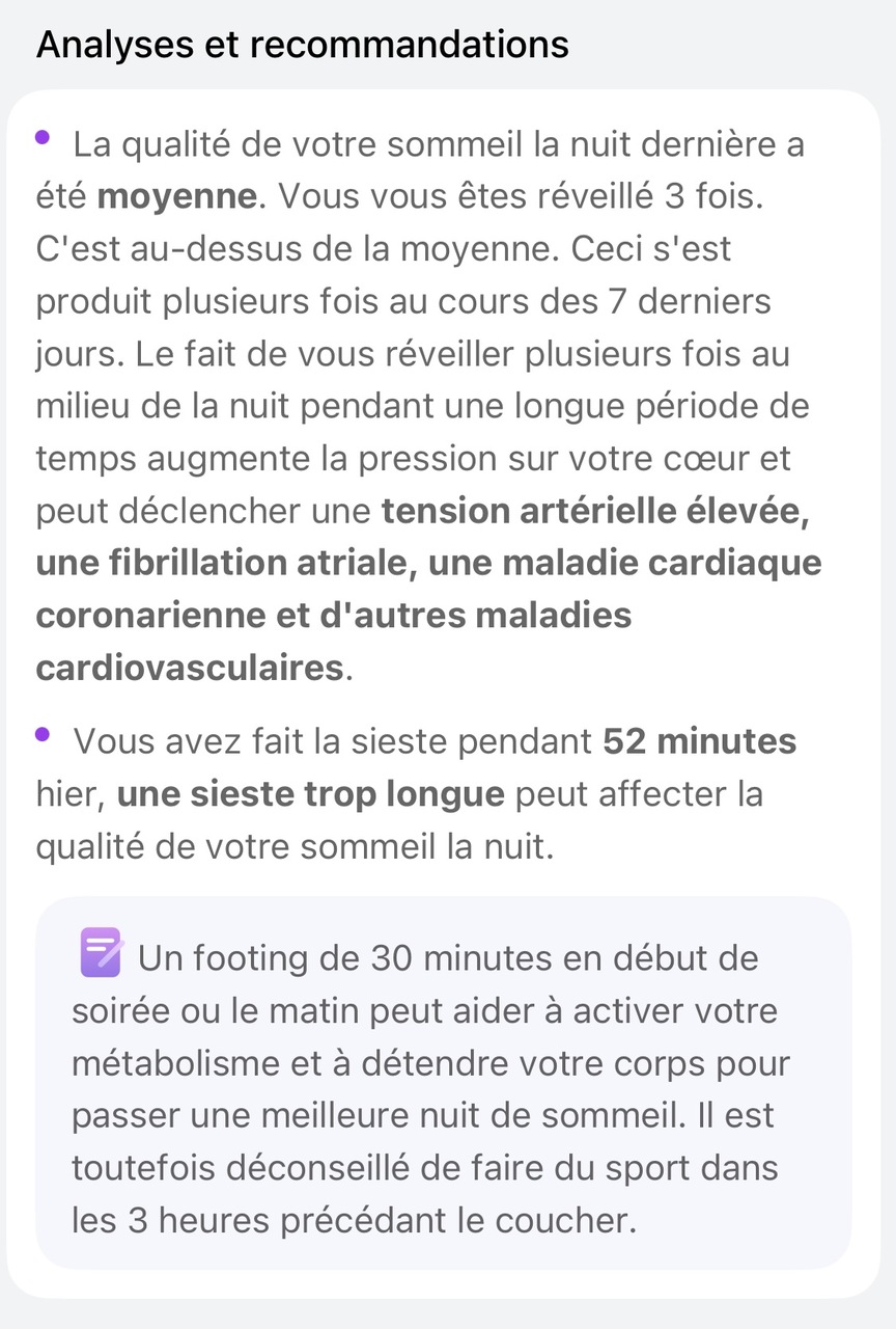 En théorie, c’est sympa. Mais quand on creuse, les recommandations restent basiques et assez génériques. Que ma nuit ait été correcte ou catastrophique (moins de 5 heures de sommeil), bien que l’analyse indique que le sommeil est trop court, les conseils restent les mêmes, ce qui est un peu décevant.