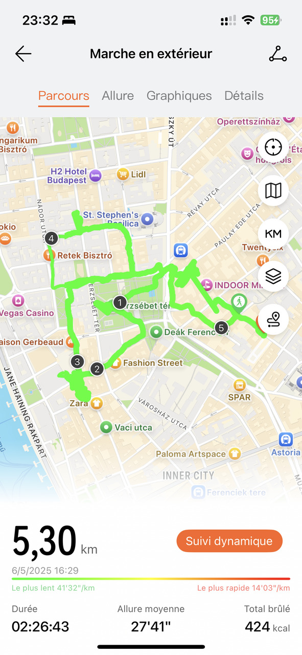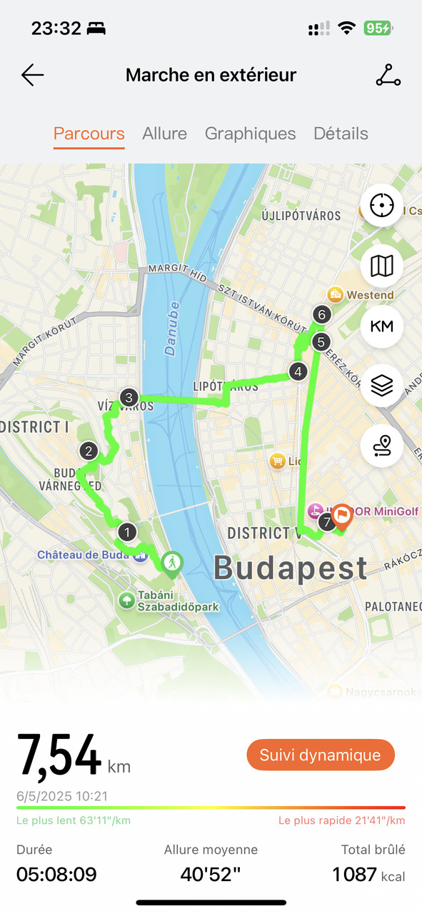 Une marche en plein centre de Budapest, dans des rues étroites, parfois encombrées ou des endroits plus dégagés, mais boisés. Là encore, la FIT 4 Pro s’est montrée très fiable, avec un suivi net et assez proche de la réalité.