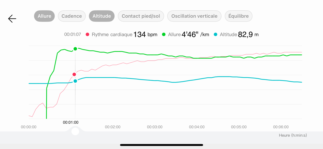 - Option de superposer plusieurs métriques (par exemple : cadence + fréquence cardiaque, ou oscillation verticale + temps de contact)