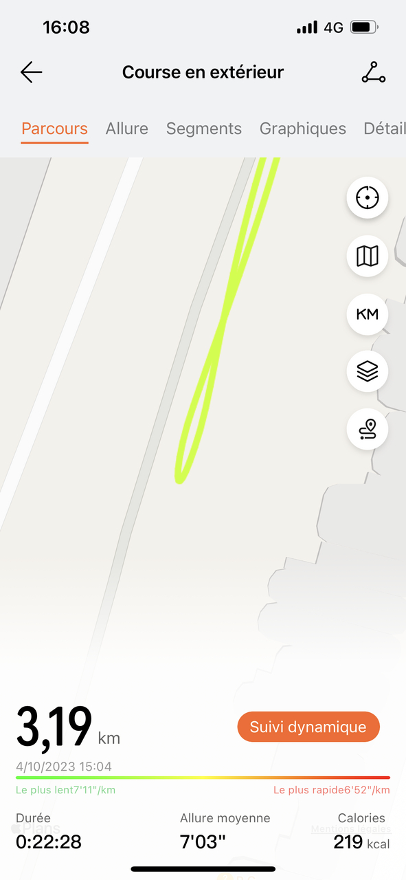 Dans des environnements dégagés, la montre s’avère très précise, offrant une précision au mètre près sur des chemins étroits lors d’une course d’entraînement à la mer du Nord. Dans des zones forestières denses par contre, les trajectoires deviennent moins précises, et la situation empire en milieu urbain, où la montre peut parfois nous faire passer à travers des bâtiments. J’avais déjà soulevé ce problème pour les modèles précédents, et bien que la GT 4 montre une légère amélioration, elle n’est pas totalement débarrassée de ces “bugs”.