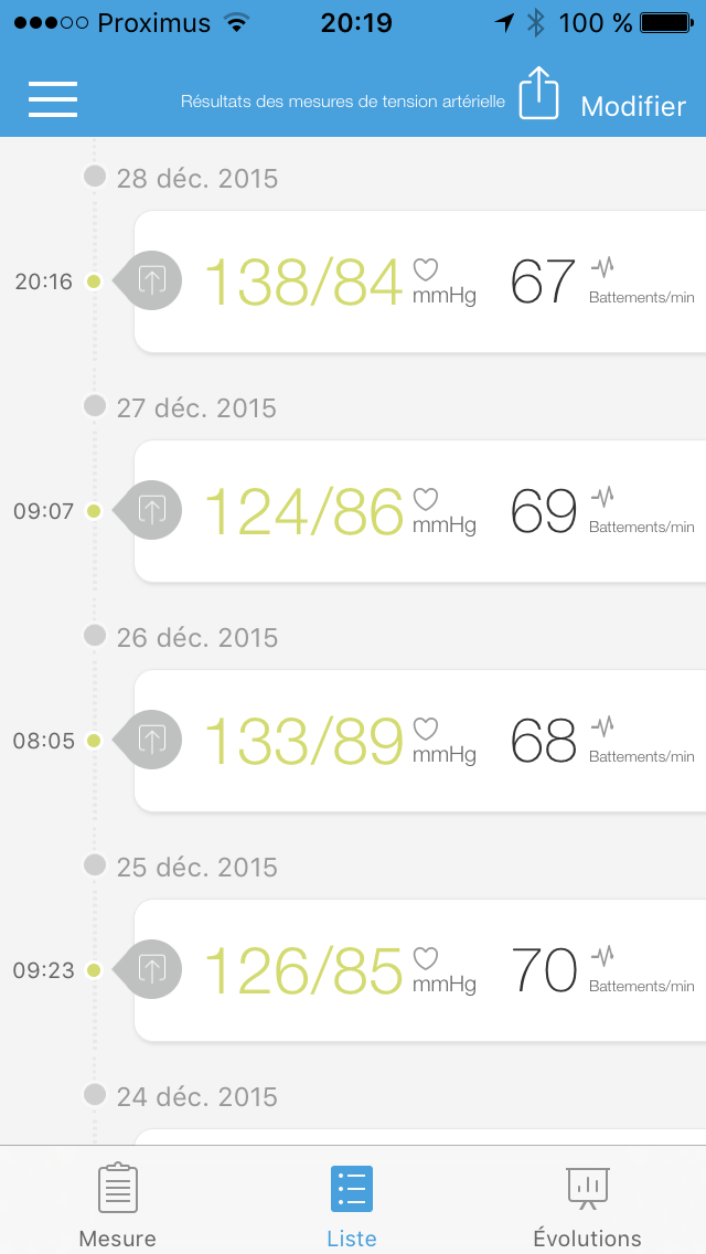 iHealth Track mesure donc la pression artérielle et la fréquence cardiaque en vous indiquant directement si les résultats son corrects (vert) moyens (orange) ou franchement mauvais (rouge). Ceux-ci sont fournis en tenant compte des recommandations officielles de l’OMS (Organisation Mondiale de la Santé). Bref, dans ce cas de figure, nous n’avons même pas encore transféré les données vers le smartphone. Et c’est là un des gros avantages de ce tensiomètre connecté : Il peut être utilisé à tout moment, même si vous ne possédez pas un téléphone iOS ou Android sous la main.