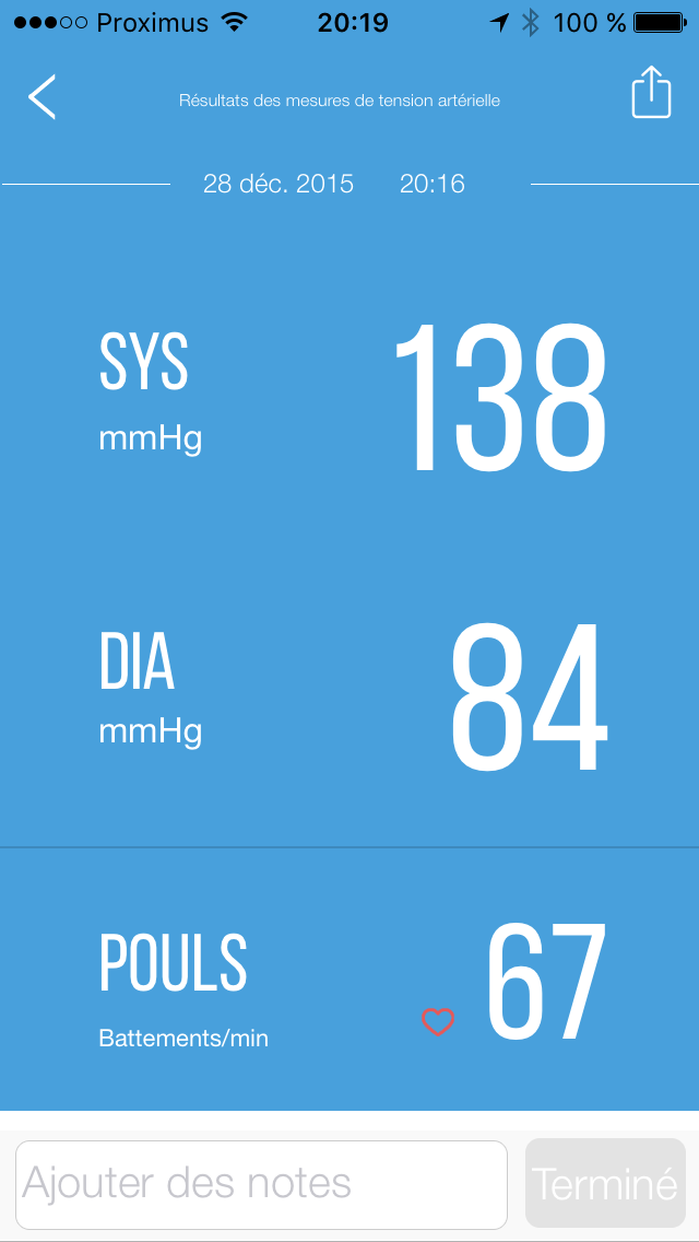 Je place le brassard autour de mon biceps, j’appuie sur le bouton “Start”, j’attends quelques secondes et voilà qu’il se gonfle (le brassard, pas le biceps). Bien, la mesure est prise assez rapidement et le sang fini par circuler normalement dans mon avant bras. Me voilà à nouveau irrigué en permanence.