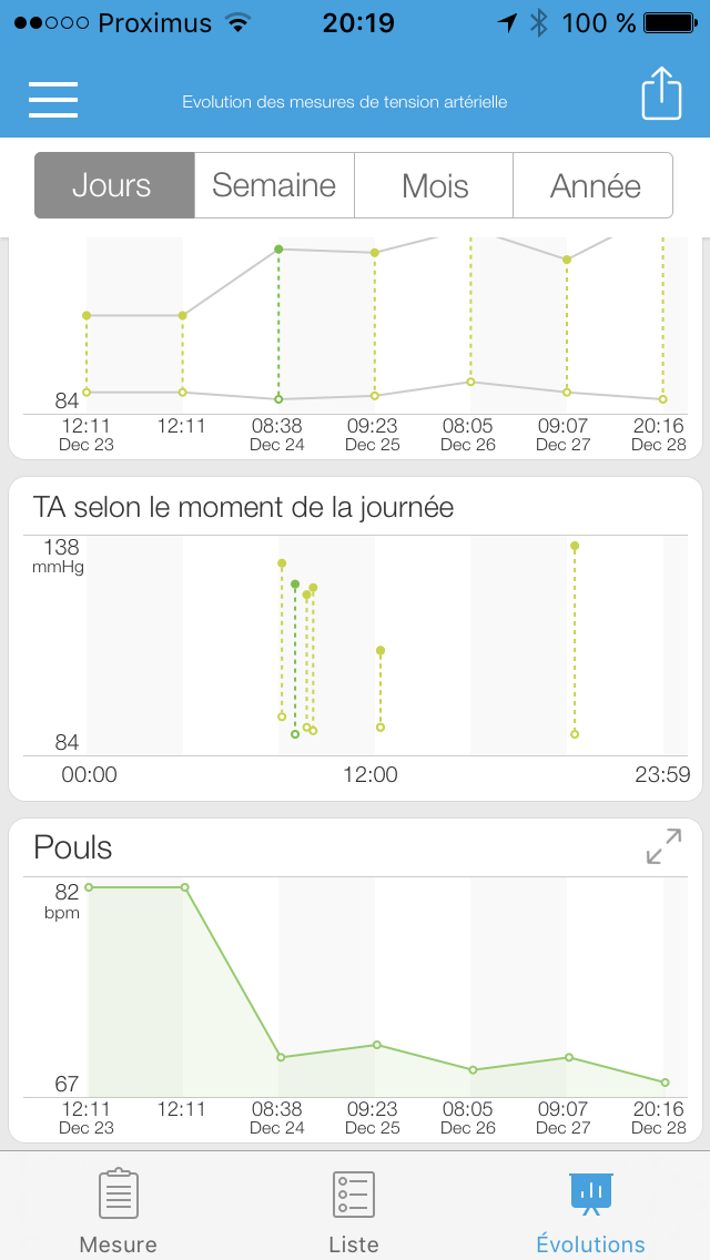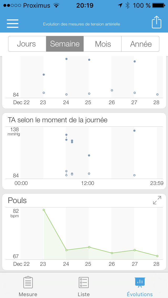 Le iHealth Track est capable de conserver jusqu’à 40 mesures pour être ensuite téléchargées sur votre smartphone en utilisant l’autre bouton représentant un nuage (Cloud). En quelques secondes, les données sont transférées et vous pourrez alors visualiser un résumé de chaque mesure ainsi qu’une courbe de l’évolution de votre tension artérielle et de votre fréquence cardiaque. Le tout est centralisé dans l’application MyVitals qui contrôle tous votre équipement iHealth. Vraiment bien joué. J’ai rarement vu une App aussi aboutie et simple à l’emploi.