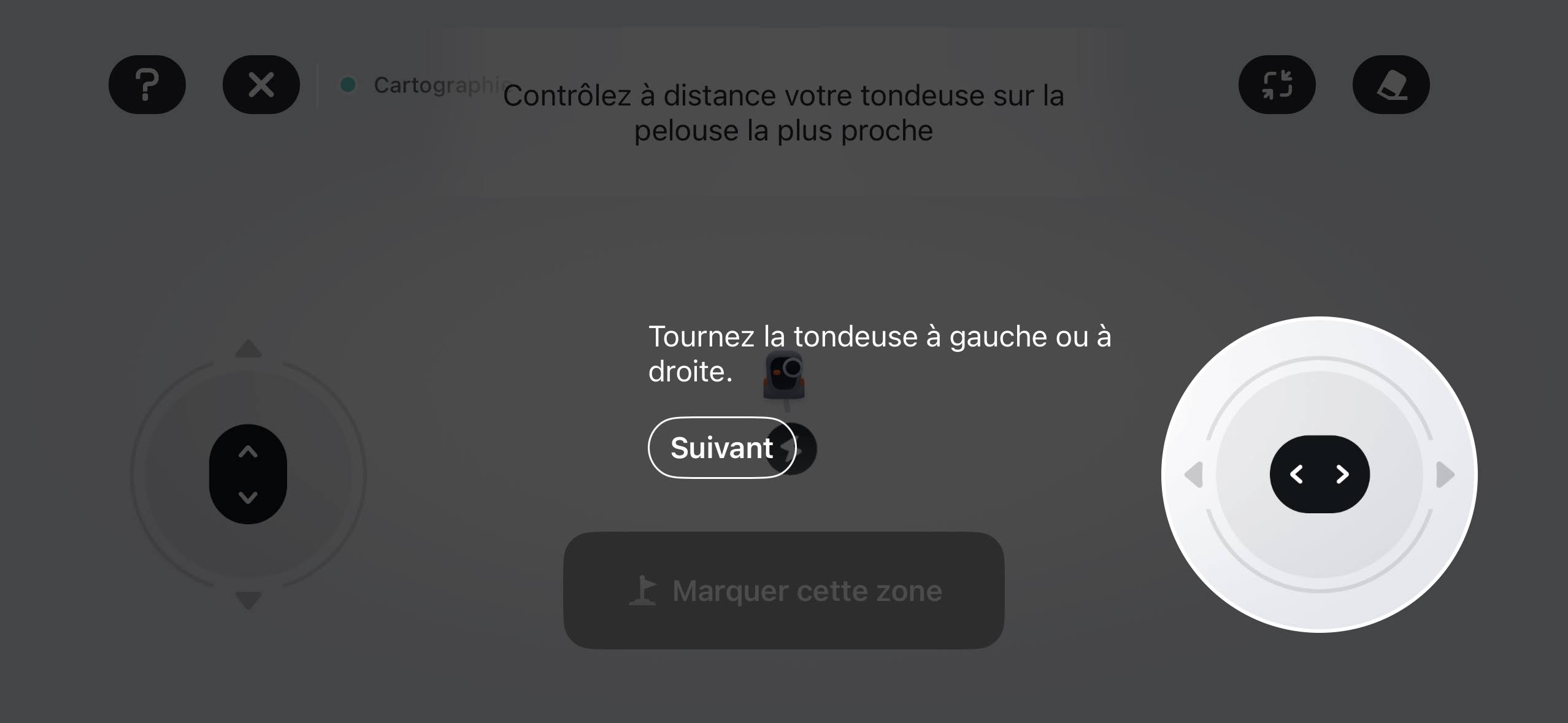 Comme vous le voyez ci-dessous, vous pourrez sélectionner les différents angles de directions de la tondeuse. Dans mon cas, elle ira uniquement en parallèle de la terrasse ou des murs latéraux, une tonte sur deux. Pratique pour obtenir une coupe homogène.