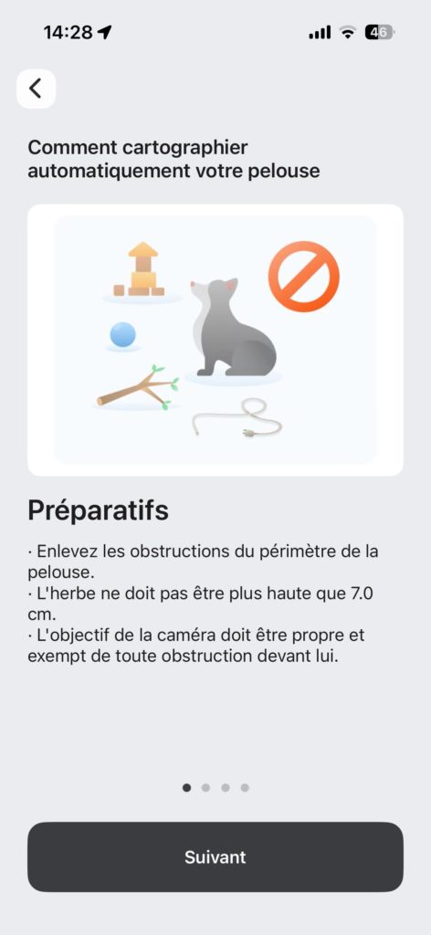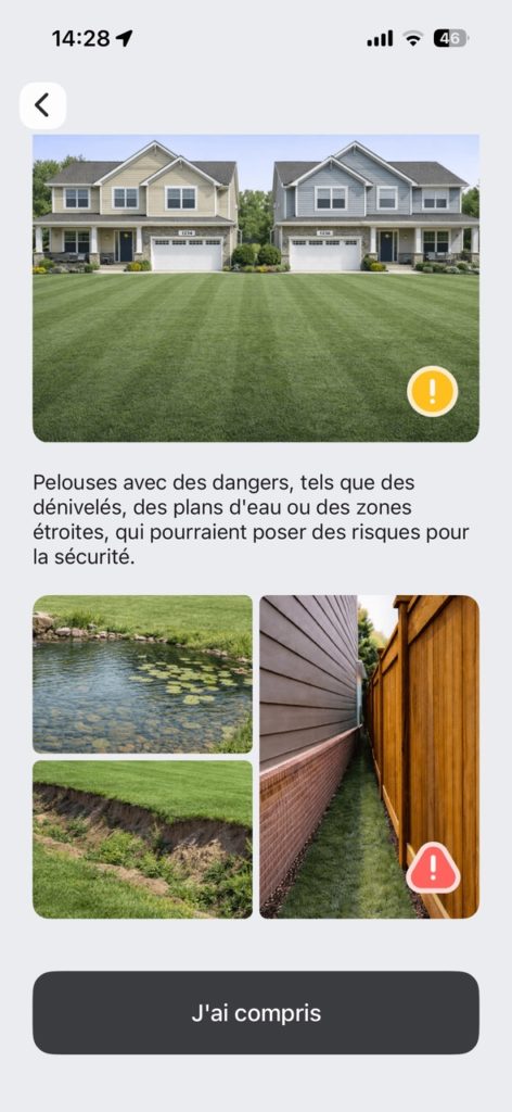 Oui, vous avez bien lu, en moins de 10 minutes, c’était opérationnel. Tout est guidé, préparé en mode “check-list” (choix du type de jardin, conseils afin de dégager les objets qui traînent, laisser les chiens et chats à l’intérieur, ne pas avoir une pelouse qui ressemble à la foret amazonienne, etc.). L’objectif est d’avoir une superficie la moins encombrée possible d’objets qui n’ont rien à y faire habituellement.