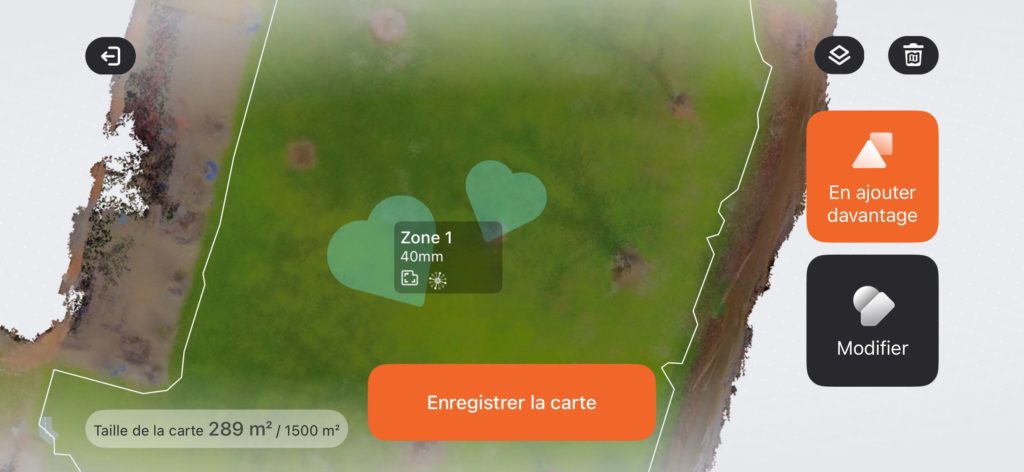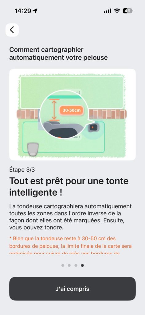 Le choix a été simple pour moi : Etant donné que mon objectif était que la tondeuse soit opérationnelle dans un temps record, j’ai opté pour la découverte automatique : Il vous suffit de balader la tondeuse quelques mètres avec votre téléphone en mode joystick, jusqu’à ce qu’elle détecte du gazon, de confirmer et, bam, la voilà partie pour une balade de reconnaissance. En moins de 10 minutes, elle avait parcouru le périmètre de mon jardin, découvert la terrasse pour la longer et s’était gentiment arrêtée à son point de départ, à-côté de la station de recharge.