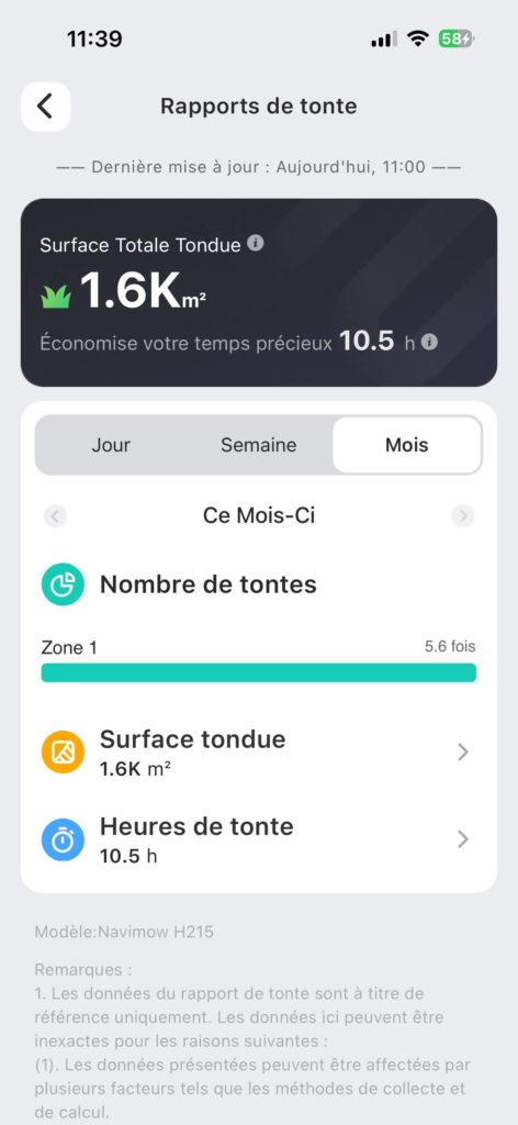 C’est évidemment là que tout se joue et je vais prendre un peu de temps car, à mes yeux, il est important de ne pas tondre tous les jours si vous n’avez pas réellement besoin (usure de la batterie). J’ai une superficie de trois ares à tondre et, après quelques mois d’utilisation avec l’ancien modèle (la i105), je me suis aperçu que tondre trois par semaine était suffisant.