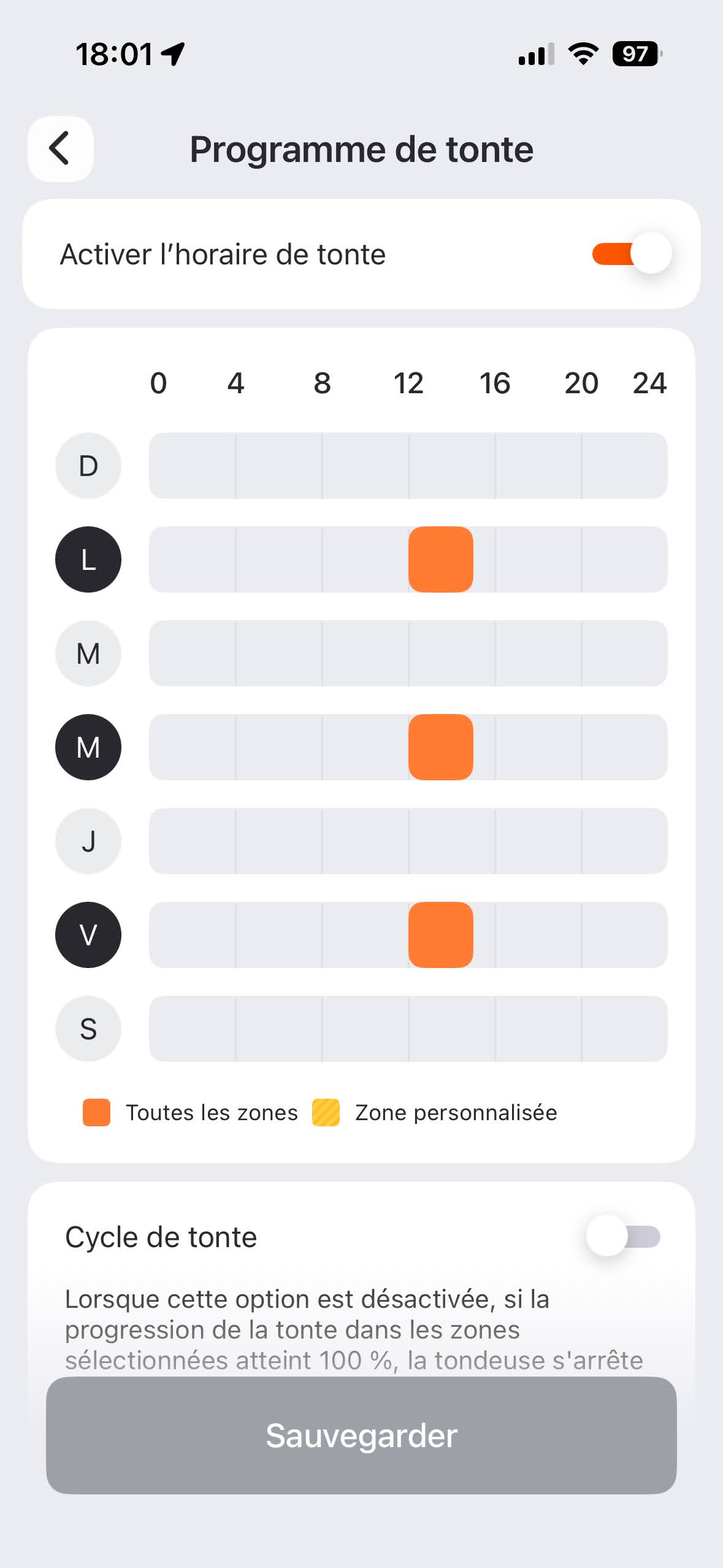 En effet, je ne souhaite pas avoir un terrain de golf de 1 mm de haut avec des lignes de passage bien marquées mais quelque chose d’assez naturel. J’ai donc choisi de tondre le lundi, mercredi et vendredi de midi à quinze heures.