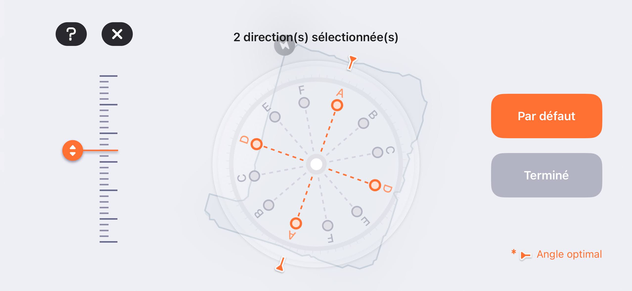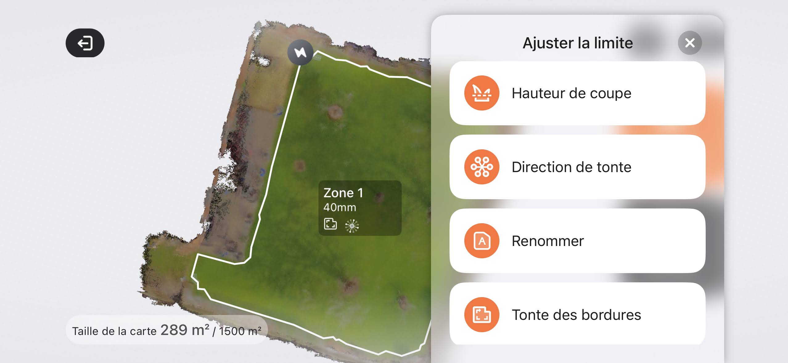 Comme vous le voyez ci-dessous, vous pourrez sélectionner les différents angles de directions de la tondeuse. Dans mon cas, elle ira uniquement en parallèle de la terrasse ou des murs latéraux, une tonte sur deux. Pratique pour obtenir une coupe homogène.
