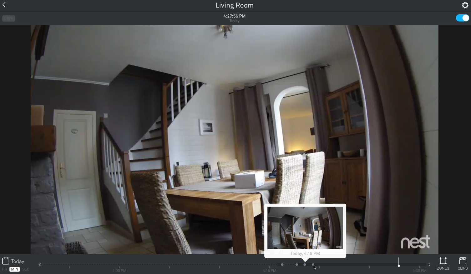Mais le gros bonus vient ensuite. Je me suis connecté via un navigateur sur l’interface Web de Nest et là, c’est la grand claque. Quelle maîtrise ! Il s’agit, ni plus ni moins, de la meilleur interface que j’ai pu rencontrer : C’est fluide, l’historique et les preview sont gérés dynamiquement, tout s’emboite parfaitement, c’est le rêve. De plus, il est même possible de créer des clips vidéo afin de les extraire par la suite et les télécharger. Sans oublier l’ajout de zones de détection spécifique pour le bruit ou le mouvement. Vous pouvez zoomer, écouter et parler dans un écran sans qu’aucun freeze ne vienne encombrer. Une véritable prouesse.