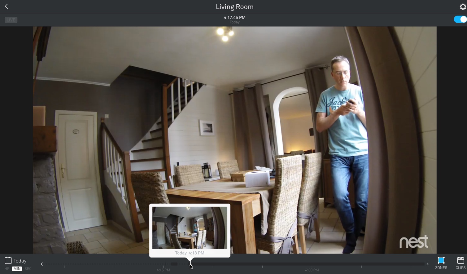 Durant 30 jours, vous aurez droit à tester le Nest Aware (Quel nom !) pour voyager dans le temps. En effet, vous pourrez remonter dans le passé et visualiser ce qui c’est déroulé chez vous durant les étapes de détections de mouvements ou de bruits. Ensuite, il vous faudra payer 10€ par mois pour obtenir un historique de 10 jours (toute caméras confondues) ou 30€ pour 30 jours d’historique. Au vu de la qualité des séquences vidéos et de l’interface absolument maitrisée de bout en bout, cela n’est pas cher payé pour une sauvegarde dans le Cloud. Oui, certains vont encore me dire que payer pour un service, c’est mal et que d’autres le font gratuitement. Sauf que nous ne parlons pas de la même qualité de service… Il faut savoir ce que vous voulez : Un steak blanc bleu belge insipide à 10€ du kilo ou un Angus beef plein de gout, de finesse et de gras pour 25€.