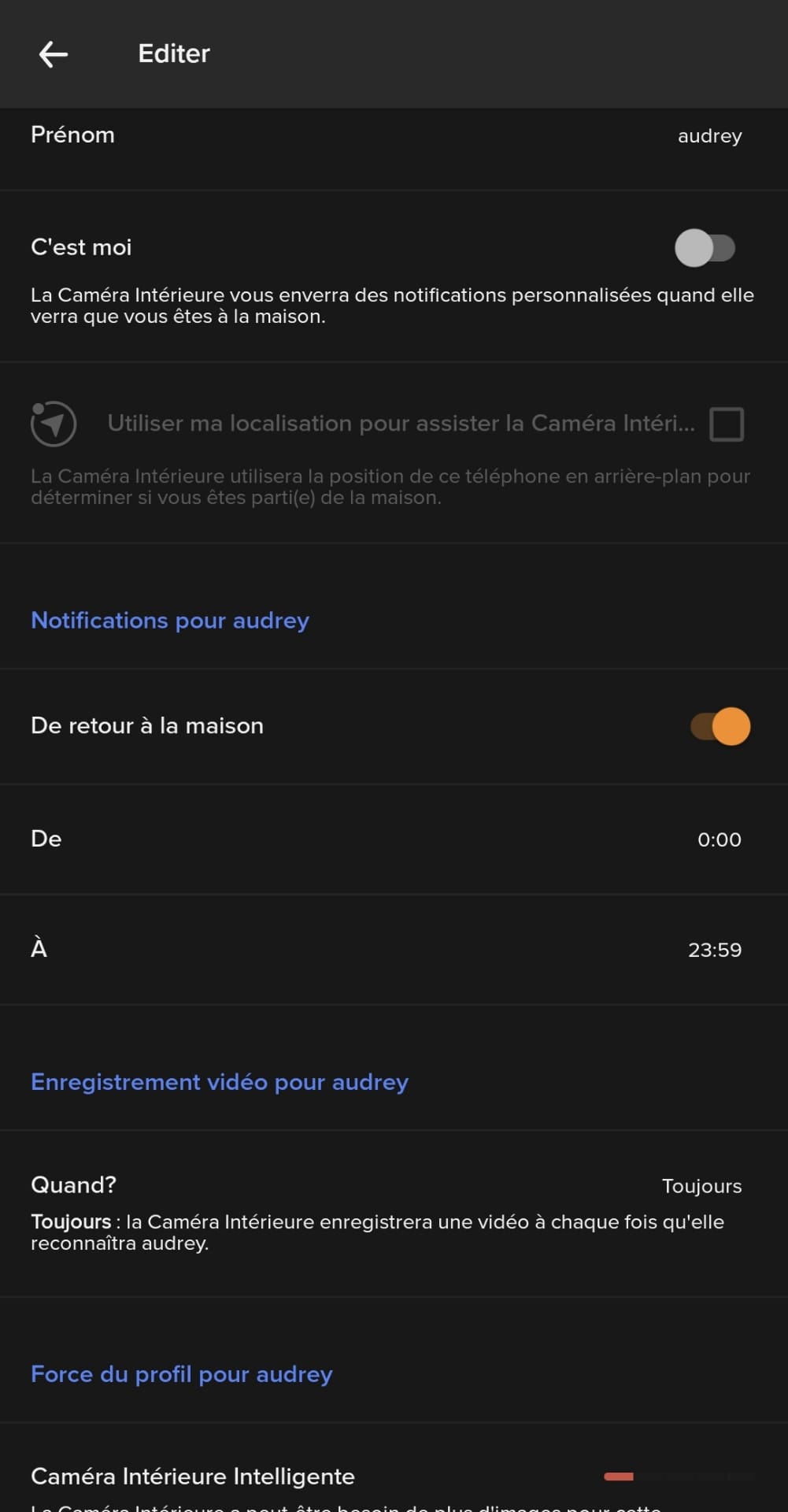 Et pourtant, là aussi la caméra ne détecte les visages que très rarement. J’ai essayé de la bouger dans toutes les directions mais rien n’y fait, la reconnaissance faciale ne fonctionne pas. Quand Audrey rentrait chez elle avec ses deux enfants, la caméra ne détectait qu’une personne et pas forcément la même. En revanche, comme le champ de vision de la caméra est large, on recevait une alerte au moindre mouvement de rideau.