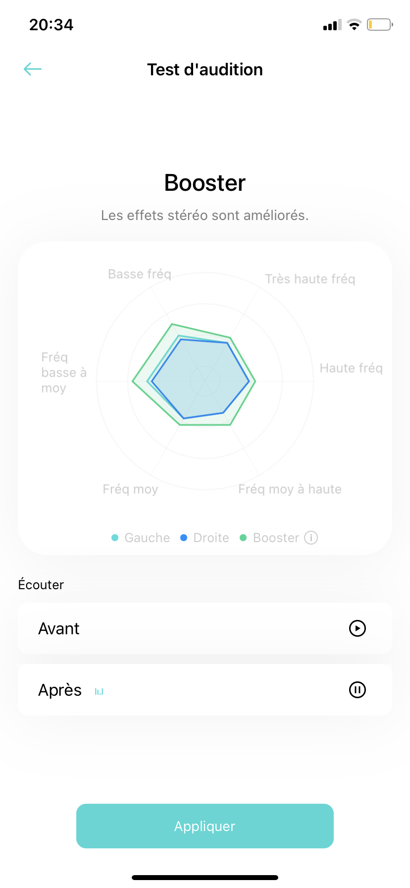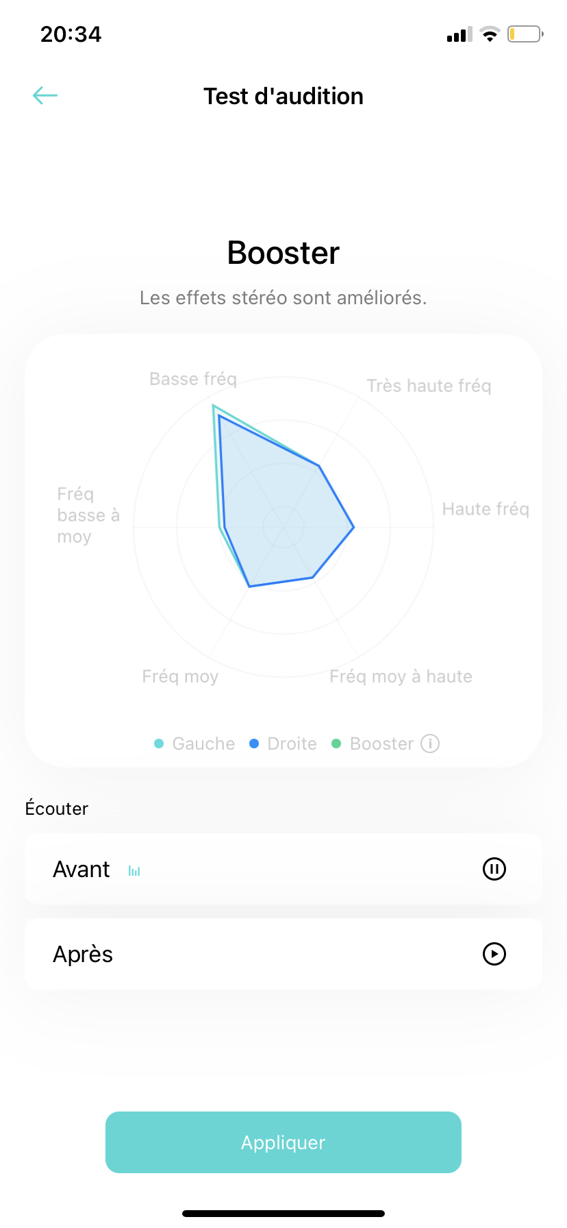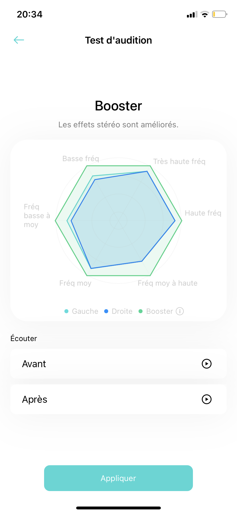 Le test terminé, l’application propose de comparer un extrait musical avant optimisation et après. La différence est bluffante, mais pour en avoir le cœur net, j’ai voulu valider l’efficacité en écoutant des morceaux de style différent avec Spotify et Deezer : Typh Barrow, Dua Lipa, Celine Dion (pour la voix cristalline, pas par amour de la chanteuse),