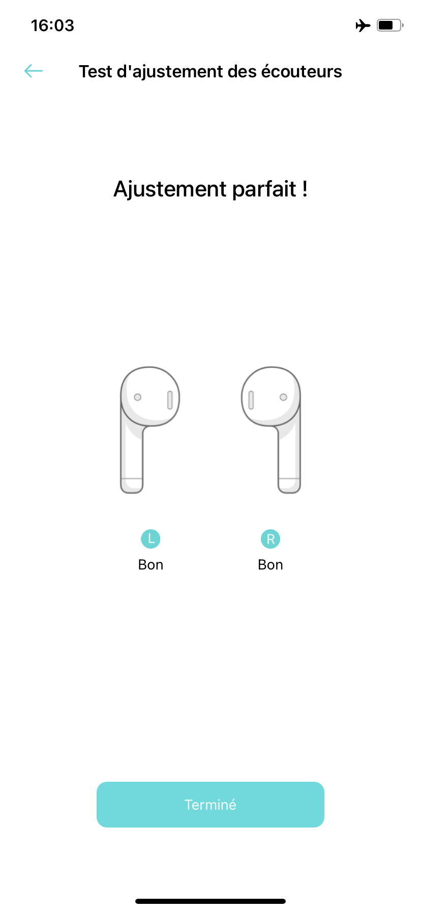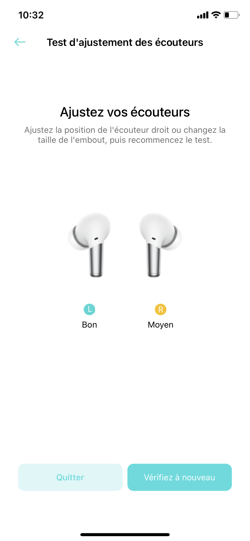 Cette fonction permet, grâce à un test audio de quelques secondes, de vérifier si les embouts installés garantissent une étanchéité parfaite du conduit auditif, et ceci, afin d’optimiser la suppression de bruit. Je sais maintenant que j’ai un conduit auditif plus grand que l’autre (Note de mon chéri : C’est pas grave, pour le reste tu es parfaite). Nous avons volontairement mal inséré un écouteur dans le but de vérifier si l’application détectait une anomalie, ce qui est le cas.