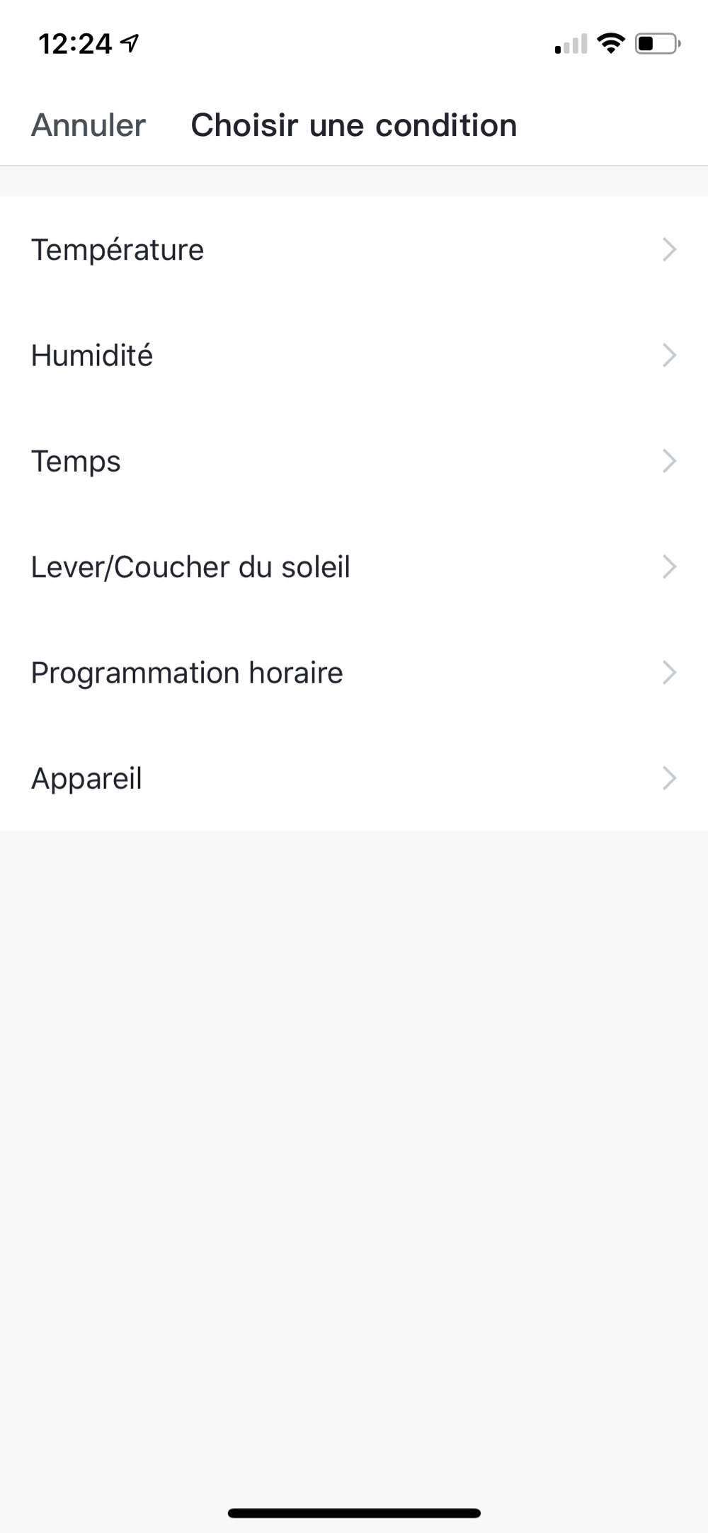 Ensuite, vous allez définir une automatisation et c’est là que la lumière fût, si je puis dire. En effet, vous avez pléthore de choix et, heureusement pour moi, l’option “Lever/coucher du soleil” est présente. Bingo ! A côté de cela, vous allez pouvoir agir sur vos prises en fonction d’autres conditions comme la température intérieure, la météo (pluvieuse, ensoleillée) ou, cerise sur le gâteau, en fonction du statut d’un autre appareil connecté ou une autre prise. Bref, le choix semble vaste et je sens que je vais revenir souvent modifier cet article en fonction de mes découvertes, et peut-être en commander d’autres à l’avenir.