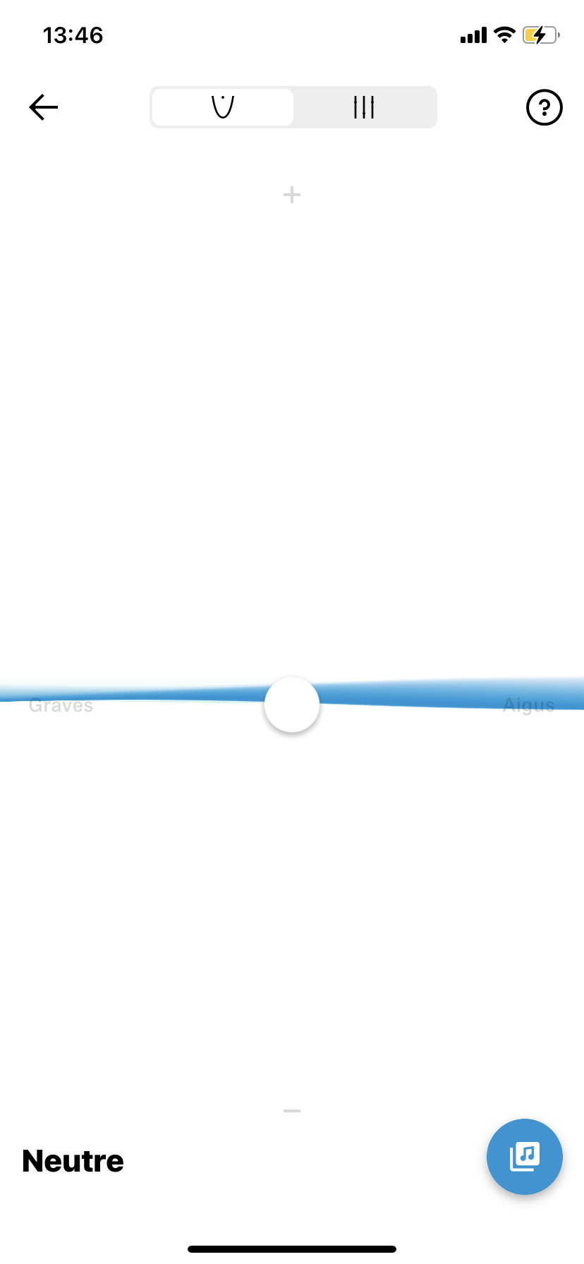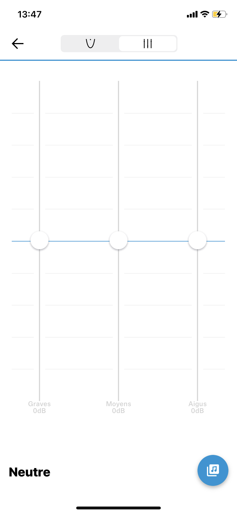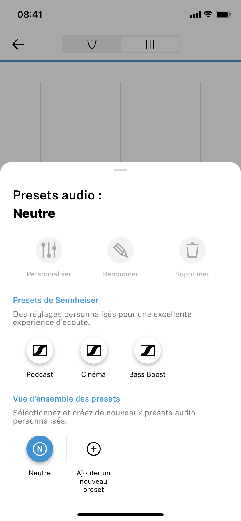 Le deuxième écran de contrôle disponible dans l’application est l’égaliseur. Vous pourrez régler les graves, medium et aigus, sélectionner des réglages préétablis par Sennheiser pour une expérience d’écoute optimale grâce aux trois presets configurés dans l’app (Podcast, Cinéma ou Bass Boost) ou ajouter et enregistrer de nouveaux réglages que vous aurez établis, si vous n’êtes pas encore tout à fait satisfait. Ces réglages manquent de finesses mais sont suffisants pour un réglage basique.