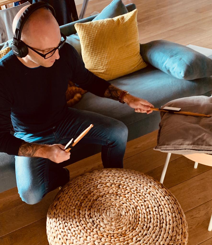 Une fois les capteurs placés sur les baguettes (taille A5 ou A7) et la zone de jeu définie à l’aide de l’application dédiée disponible sur l’App Store ou Google Play, j’ai pu transformer, en quelques clics, mon coussin en cymbale, mon pouf suédois en caisse claire et mes pieds en grosses caisses. Des pads d’entraînement sont également disponibles afin d’amortir les coups de baguettes sur les surfaces plus dures comme une table de salon par exemple, ils sont pliables et donc facilement transportables.