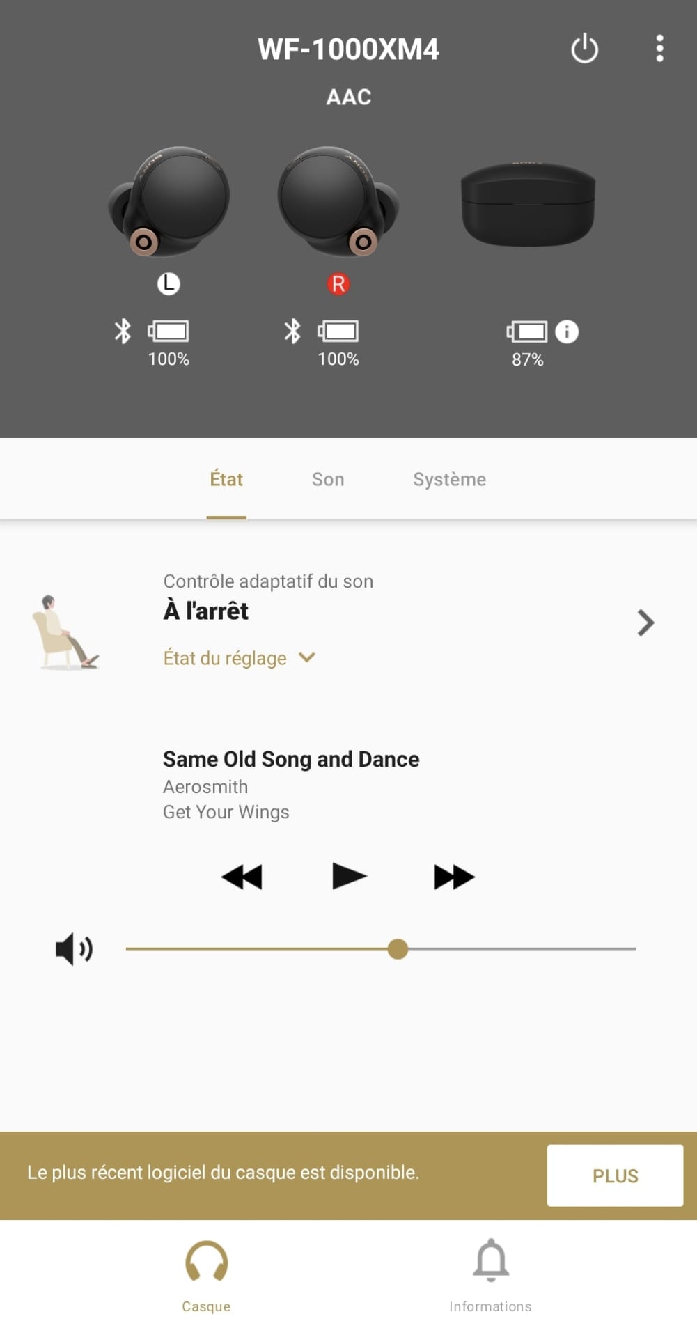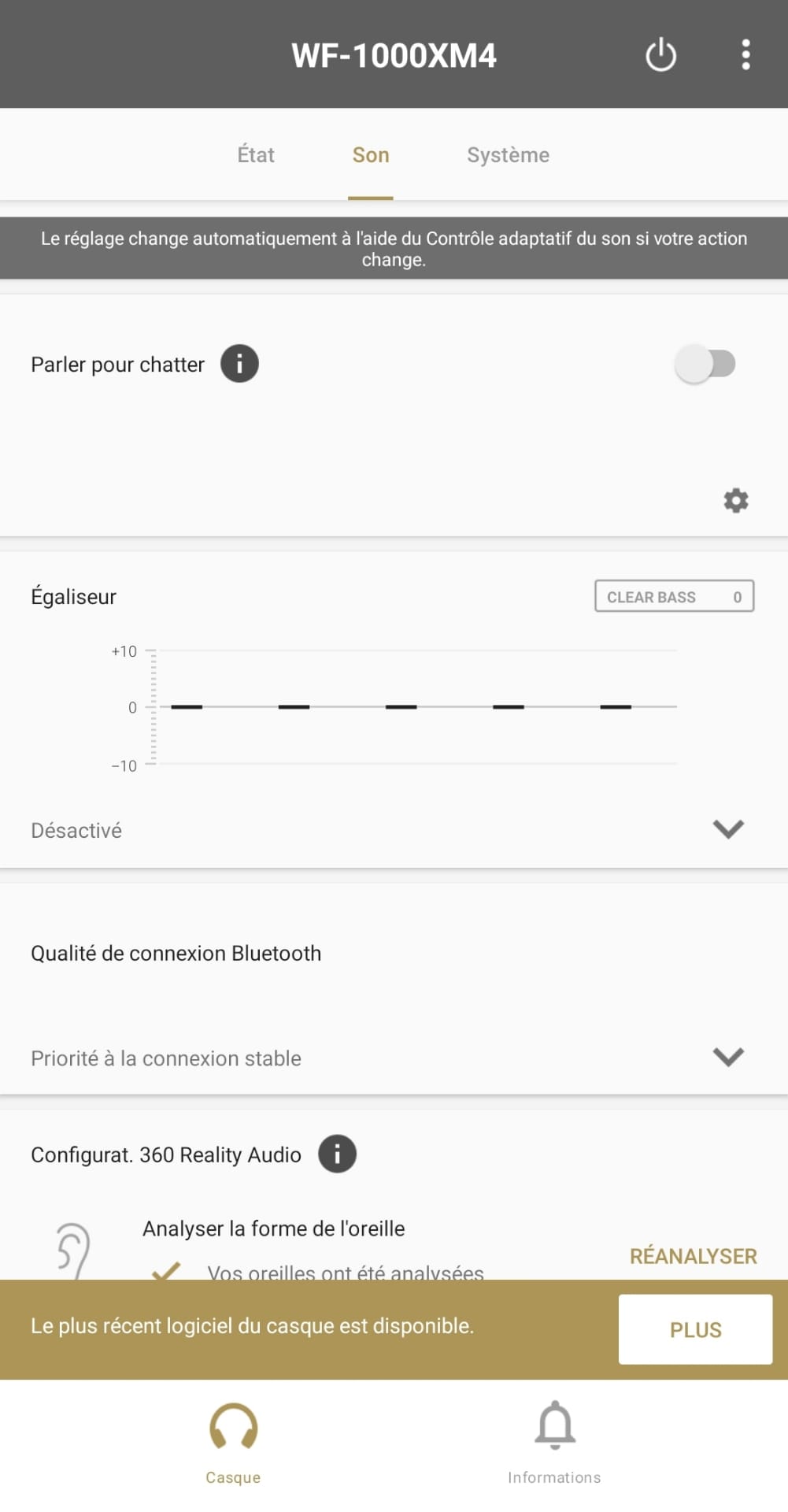La connexion établie, mon smartphone me propose le téléchargement de l’application « Headphones » de Sony. Une fois installée, l’application propose de tester le son, à la dénomination très pompeuse, de « 360 Reality Audio ». Je me dis que c’est encore une belle connerie marketing jusqu’à ce qu’à ce que je compare le son stéréo « classique » et le son « 360 Reality Audio ». La différence est impressionnante !