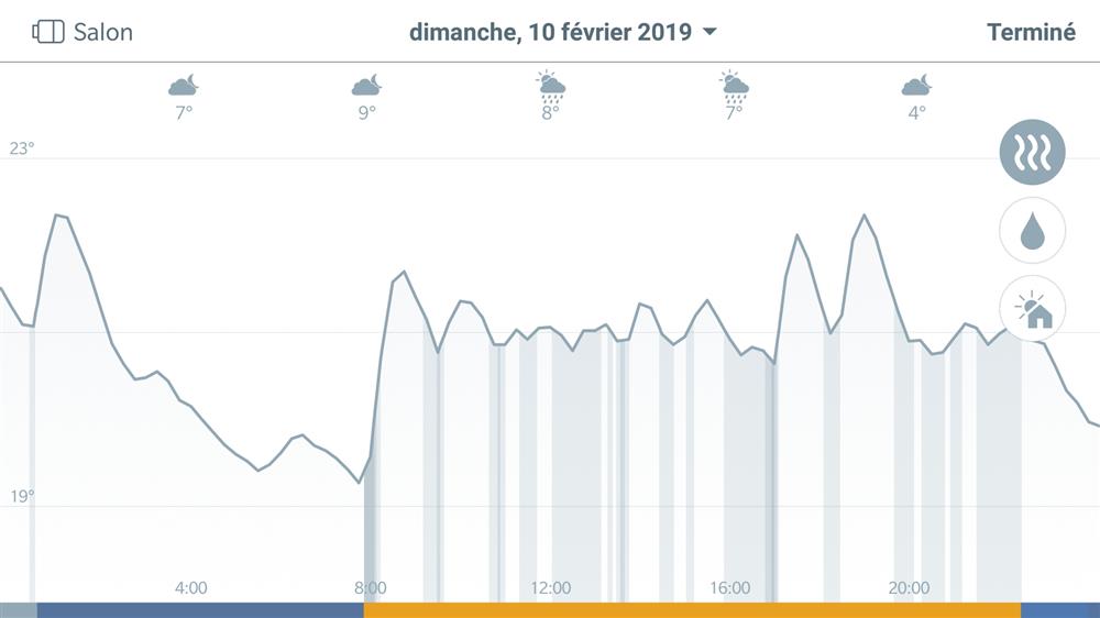 J’ai même observé plusieurs fois que le chauffage devait déclencher une seconde fois avant l’heure souhaitée tellement l’anticipation de chauffe avait été exagérée. Cette anticipation excessive allonge inutilement les périodes de chauffe ce qui coûte de l’énergie pour rien. A l’usage et pour continuer à tester le produit, j’ai fini par retarder l’heure de début des périodes de chauffe de 1h30 afin de compenser le problème et ne pas consommer pour rien. Un comble !